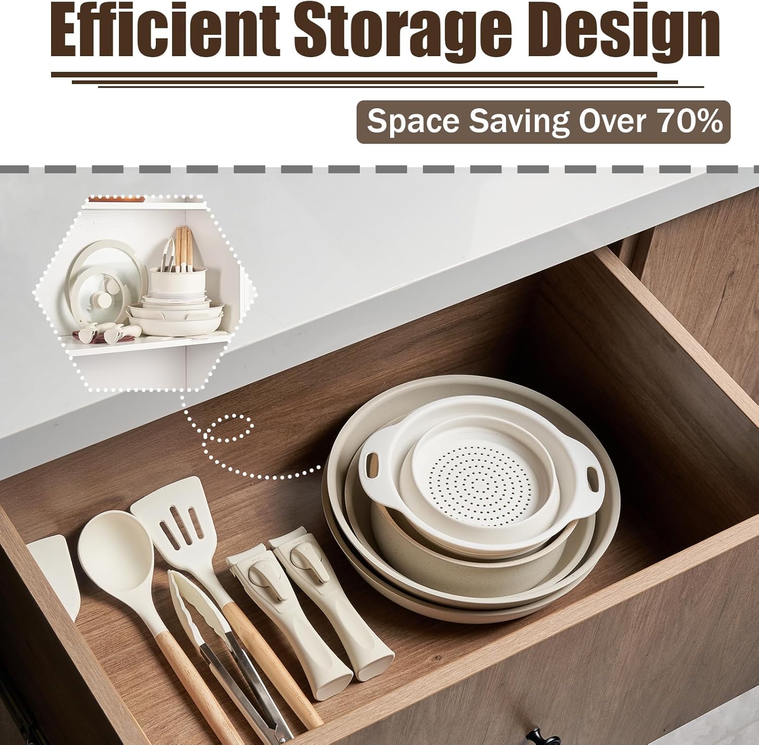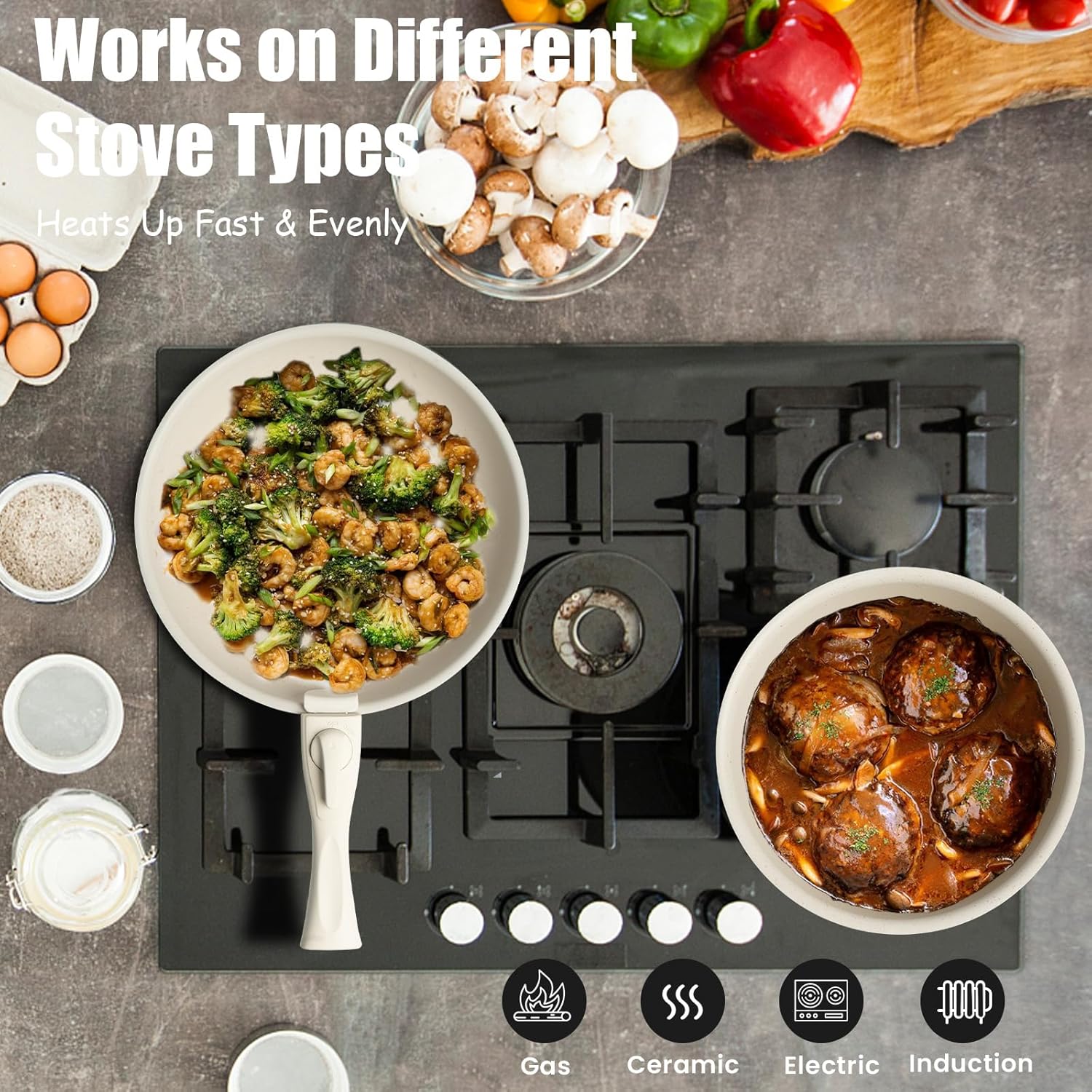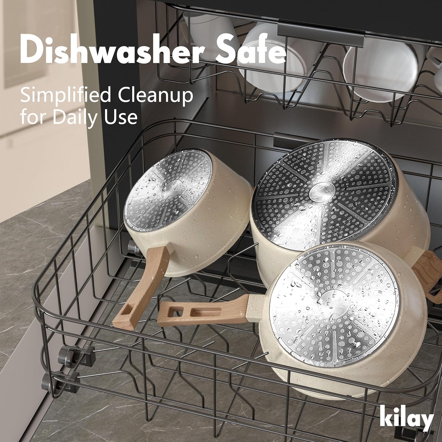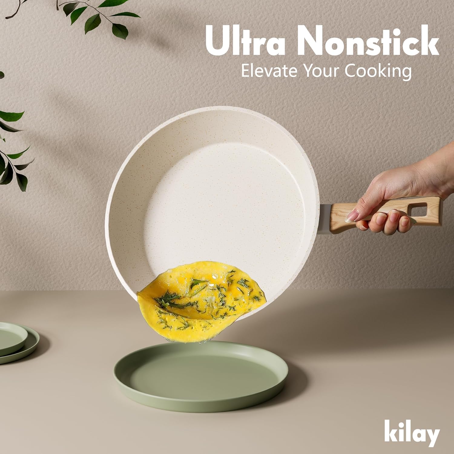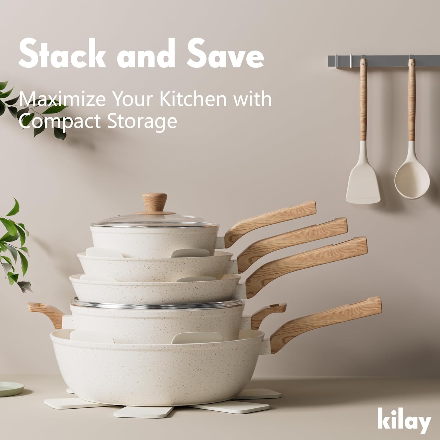 KILAY 14 Pcs Nonstick Cookware Set. White Granite Pots and Pans. Non-Stick Cooking Set with Frying Pans. Saucepans and Kitchen Utensils