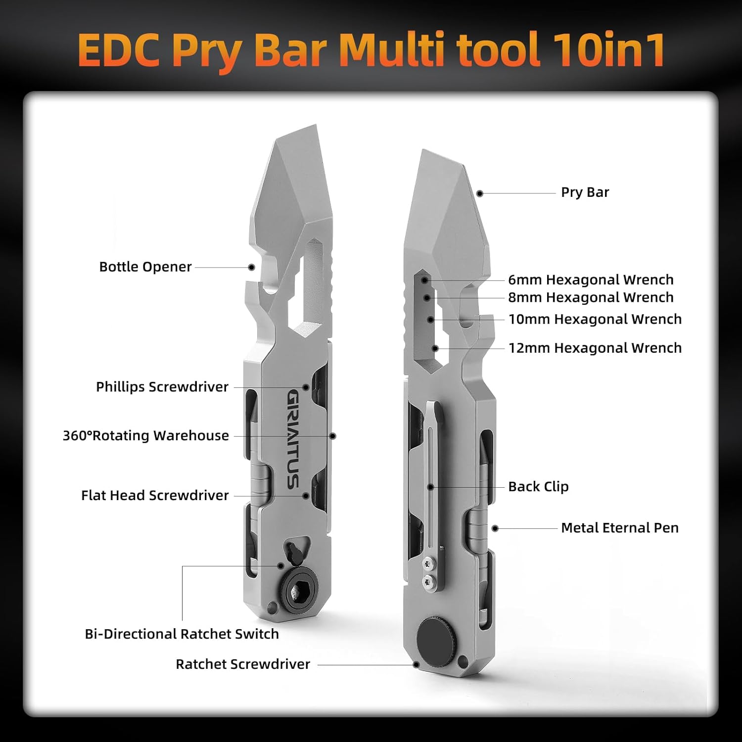 EDC Pry Bar Multitool with Bi-Directional Ratchet Screwdriver & Everlasting Pen. Wrenches. Crowbar. Bottle and Box Openers - Your Versatile Companion for Everyday Carry and Camping Accessories