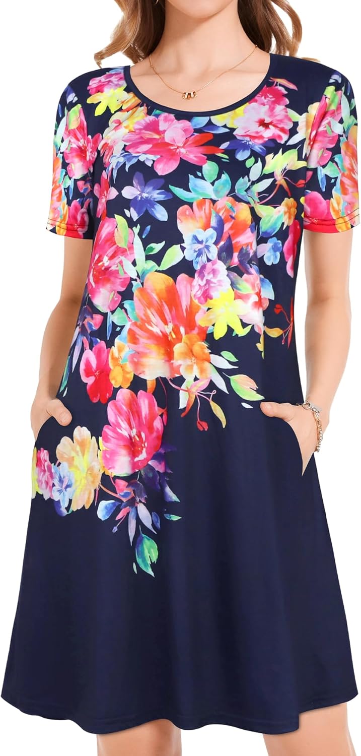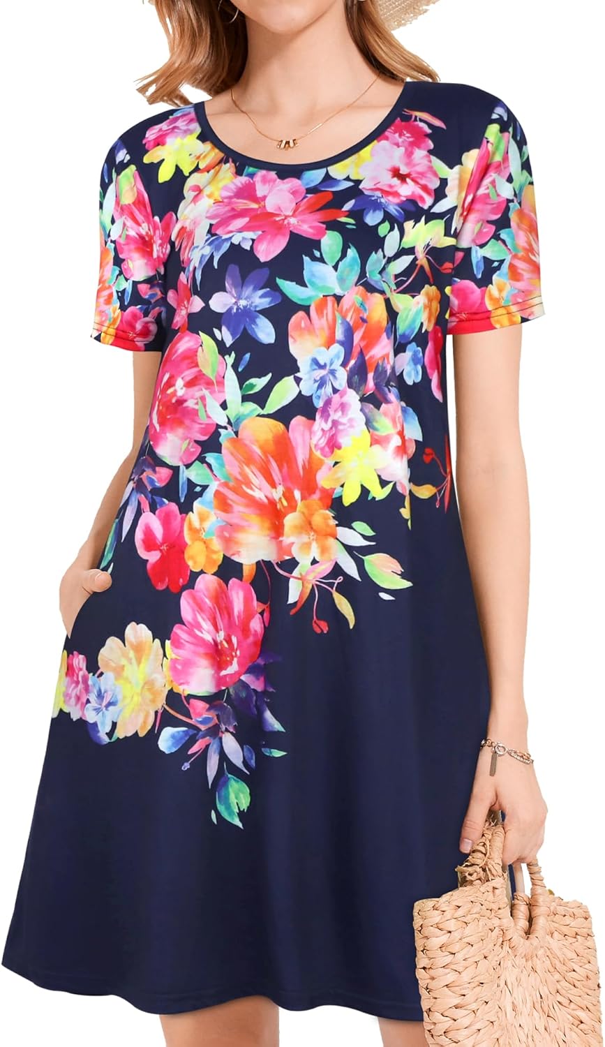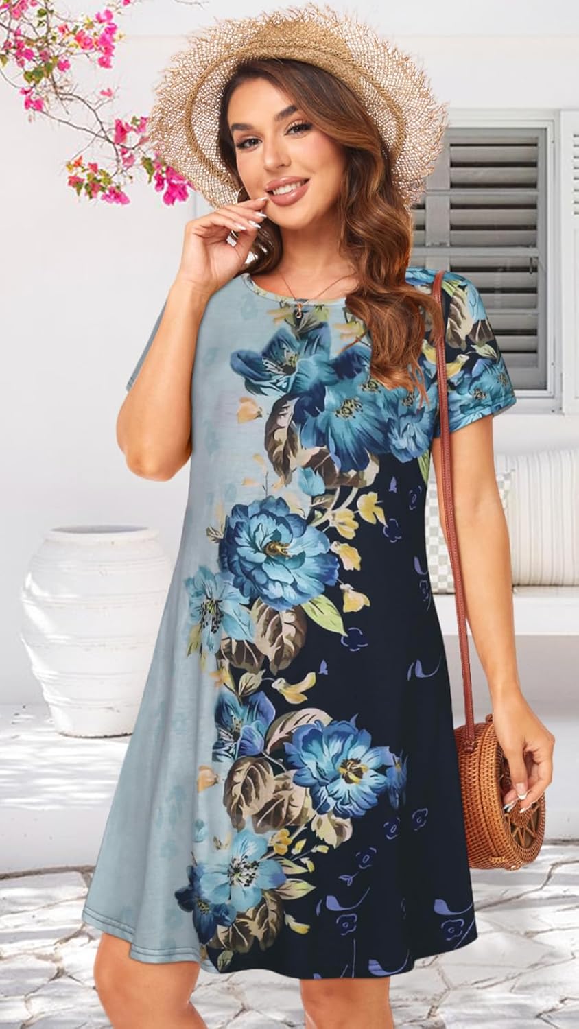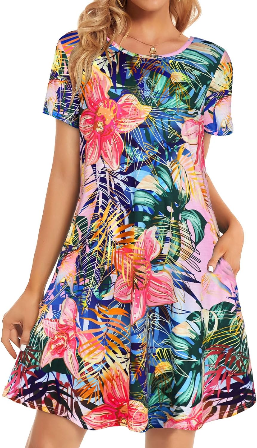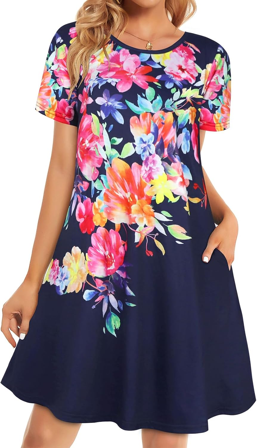 Womens Summer Dresses Beach Casual Loose Tshirt Floral Short Sleeve Flowy Pockets Sundresses