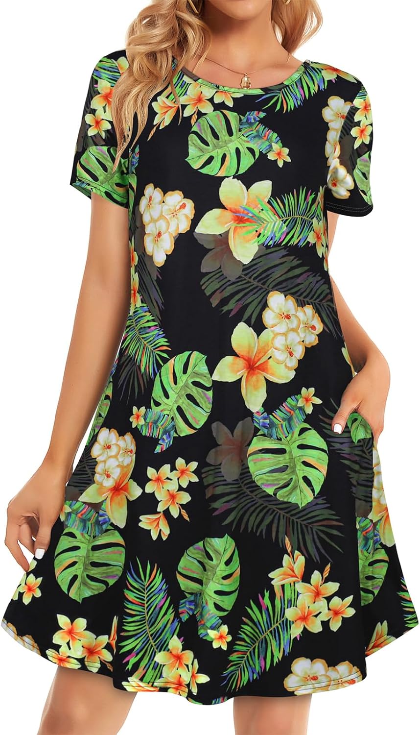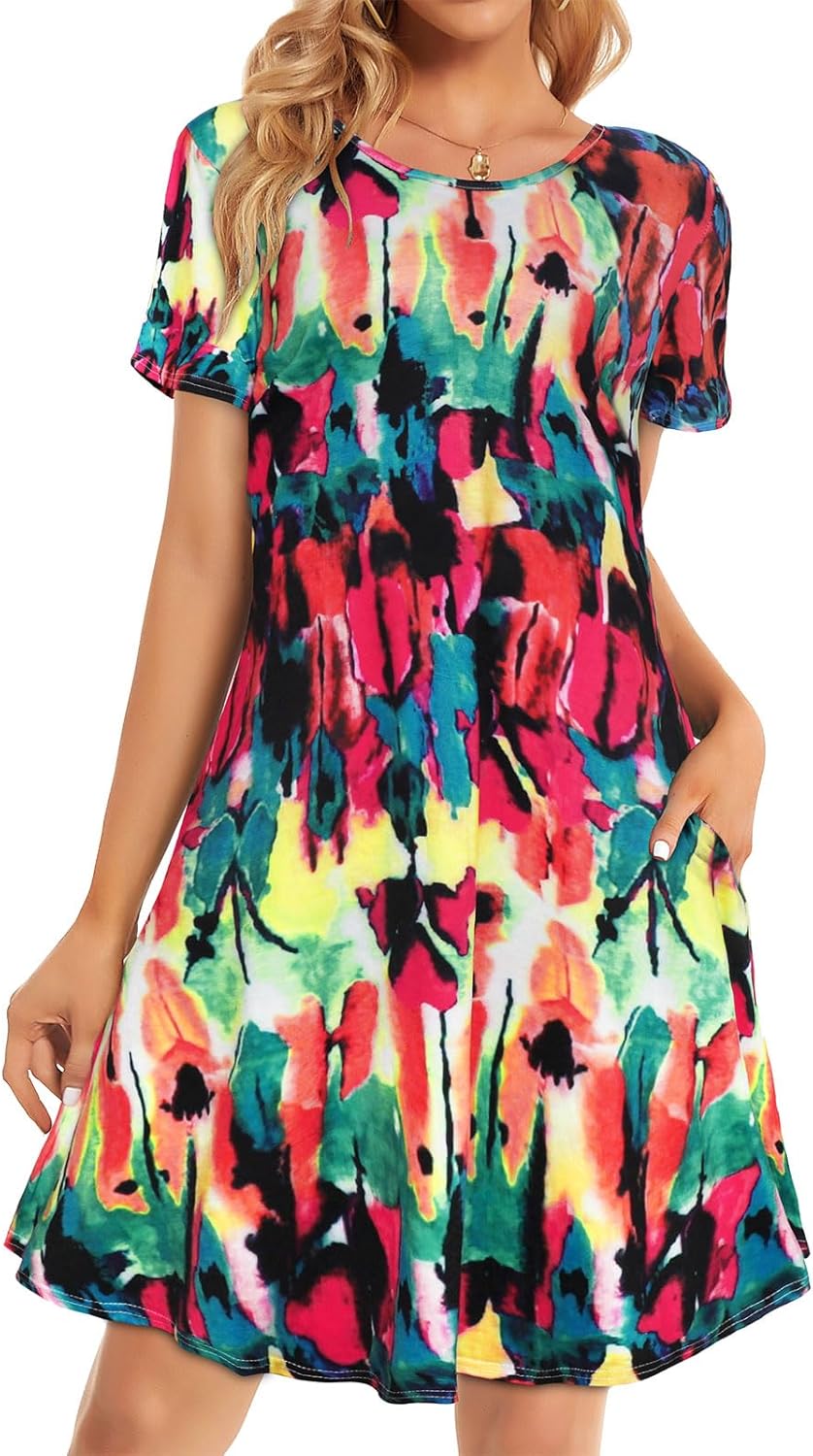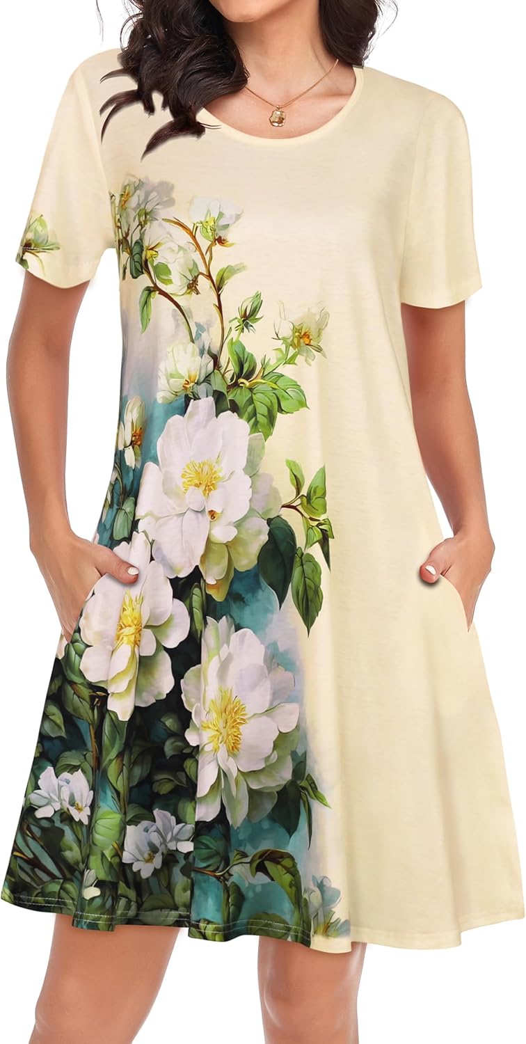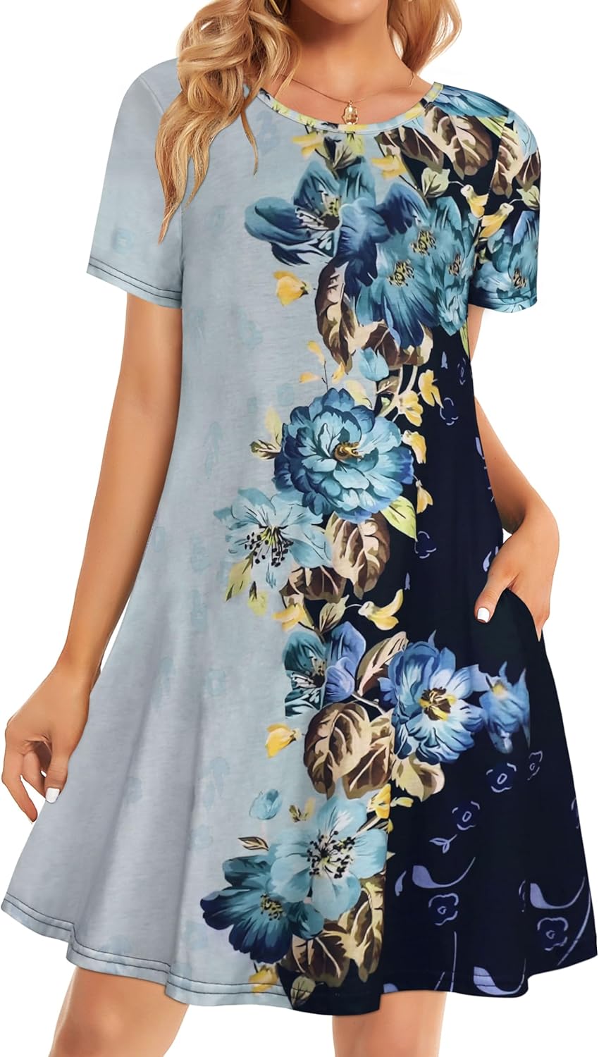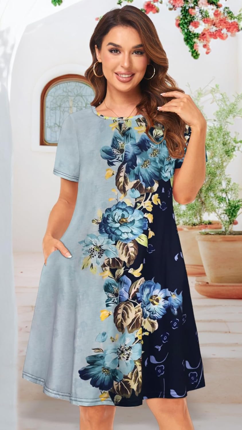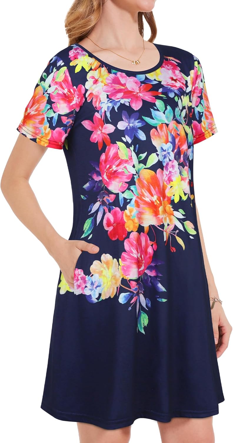 Womens Summer Dresses Beach Casual Loose Tshirt Floral Short Sleeve Flowy Pockets Sundresses