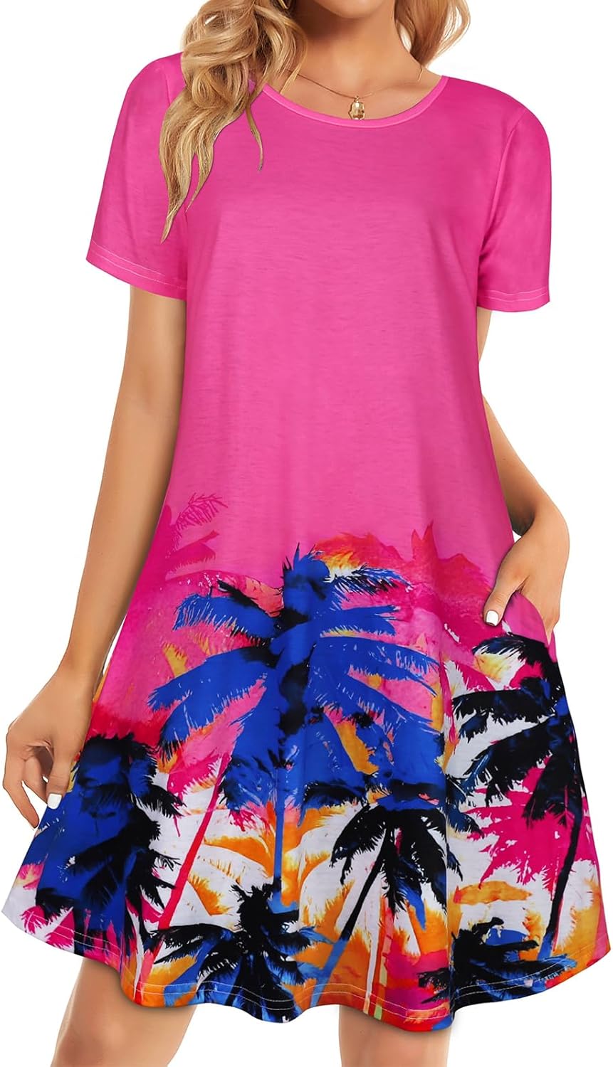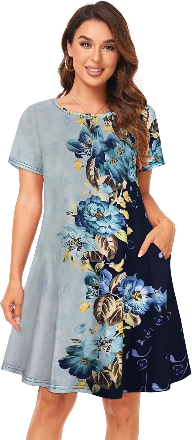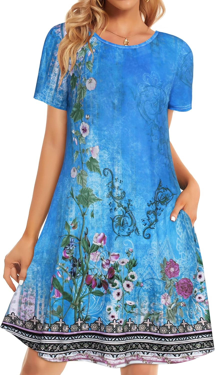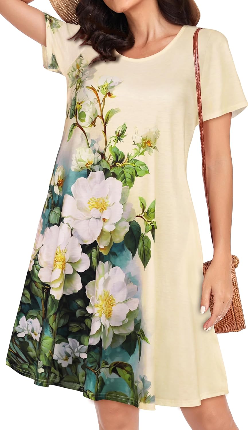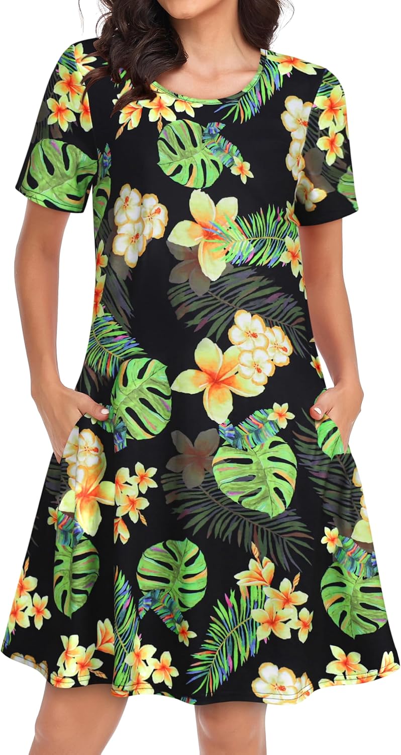 Womens Summer Dresses Beach Casual Loose Tshirt Floral Short Sleeve Flowy Pockets Sundresses