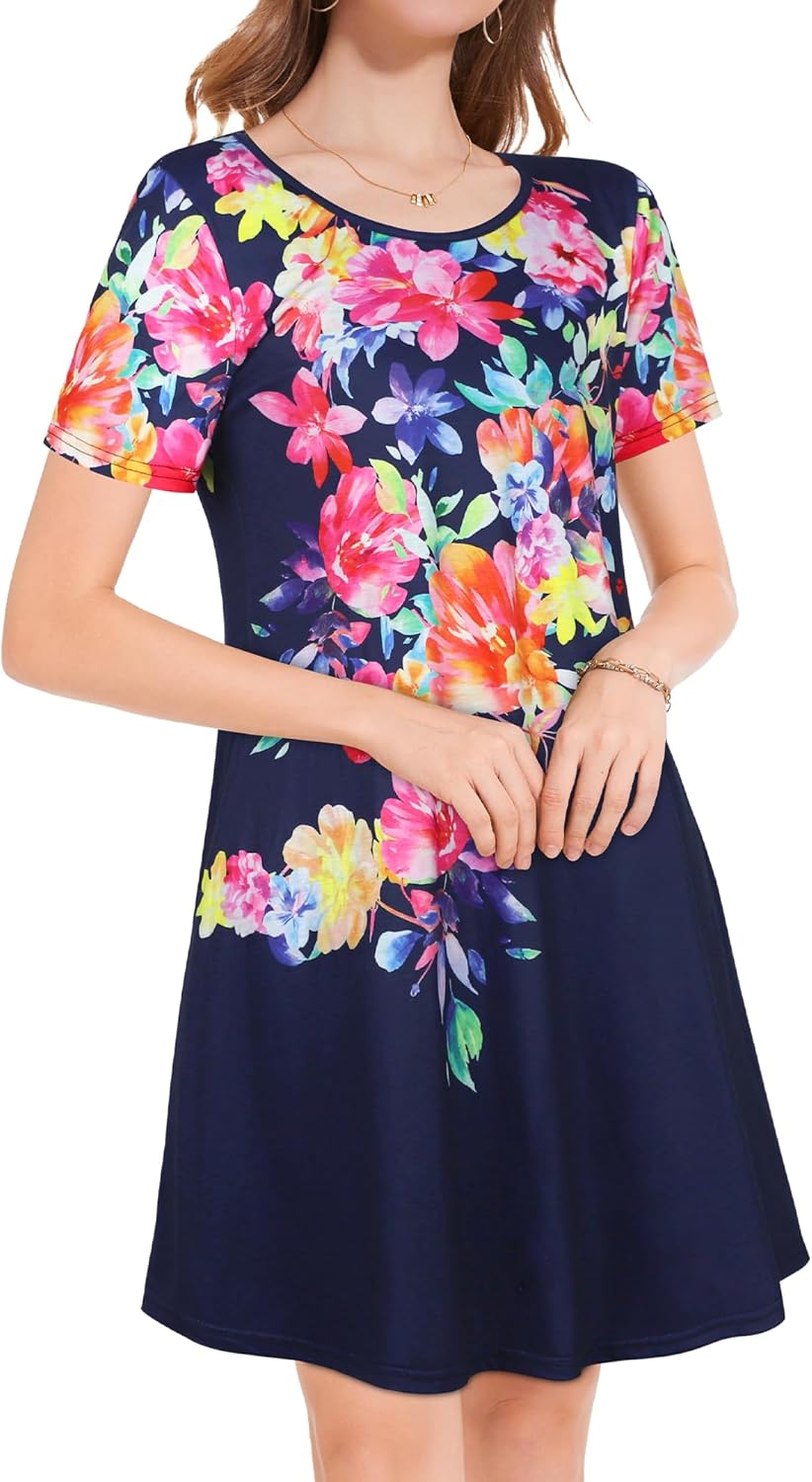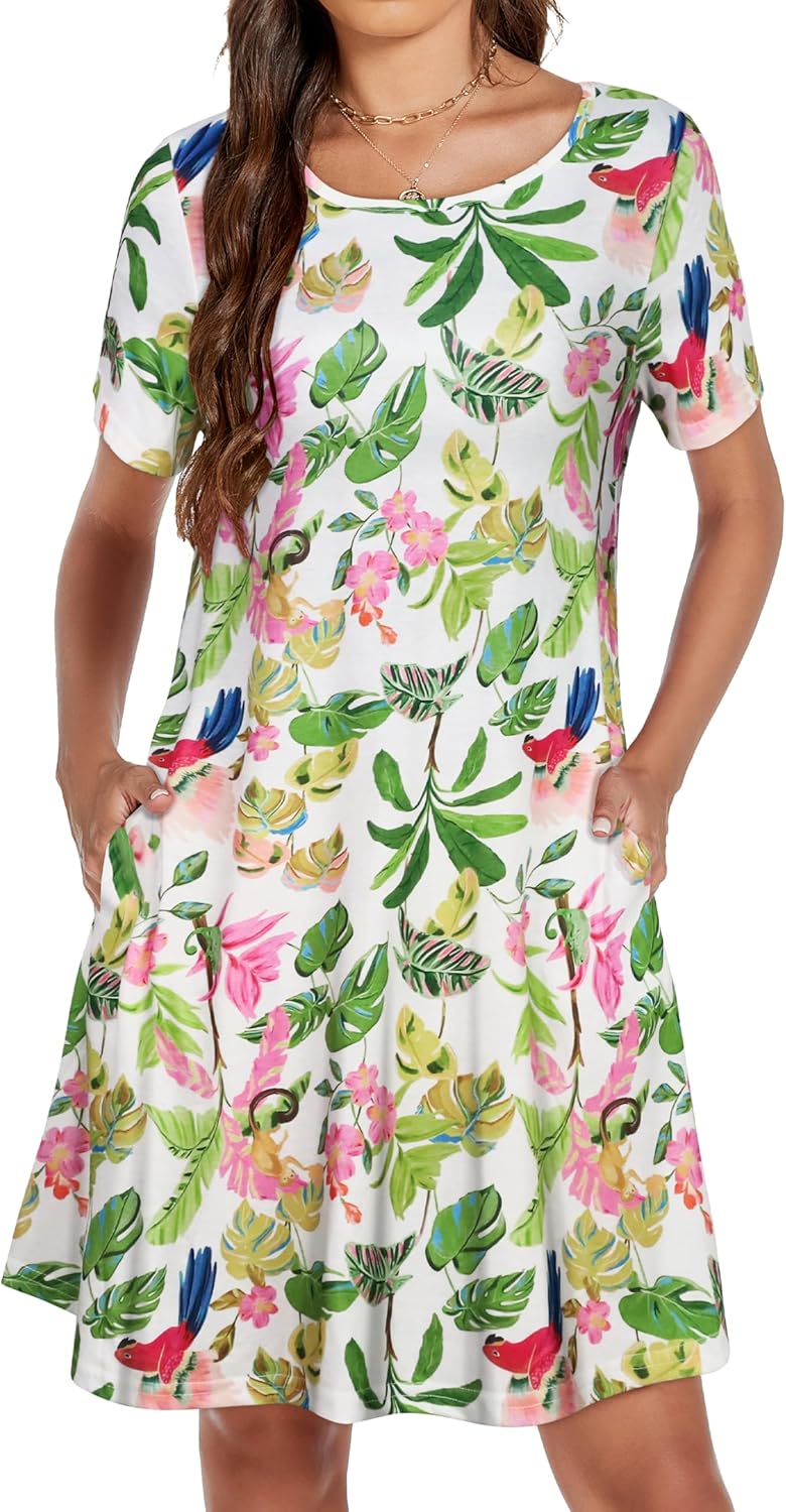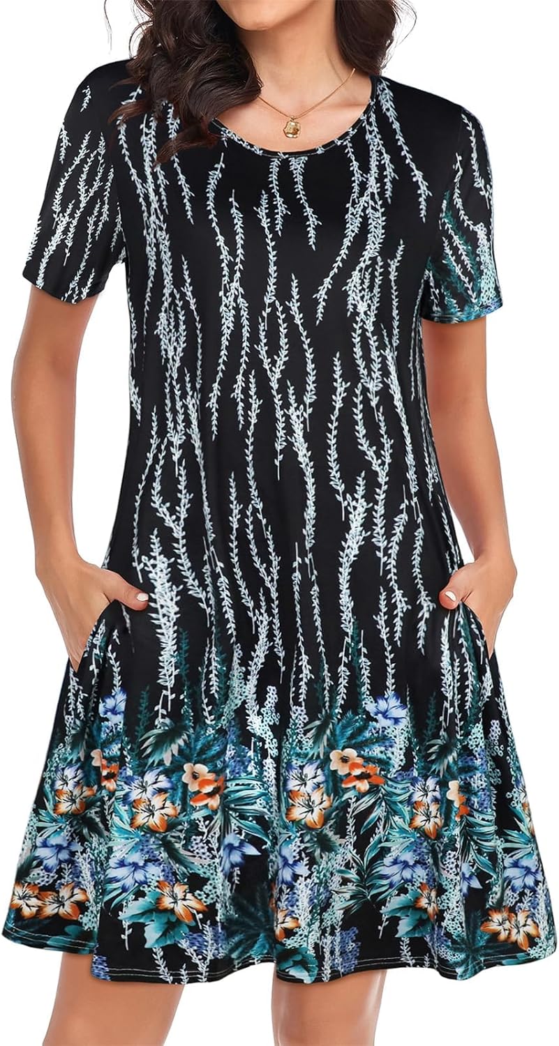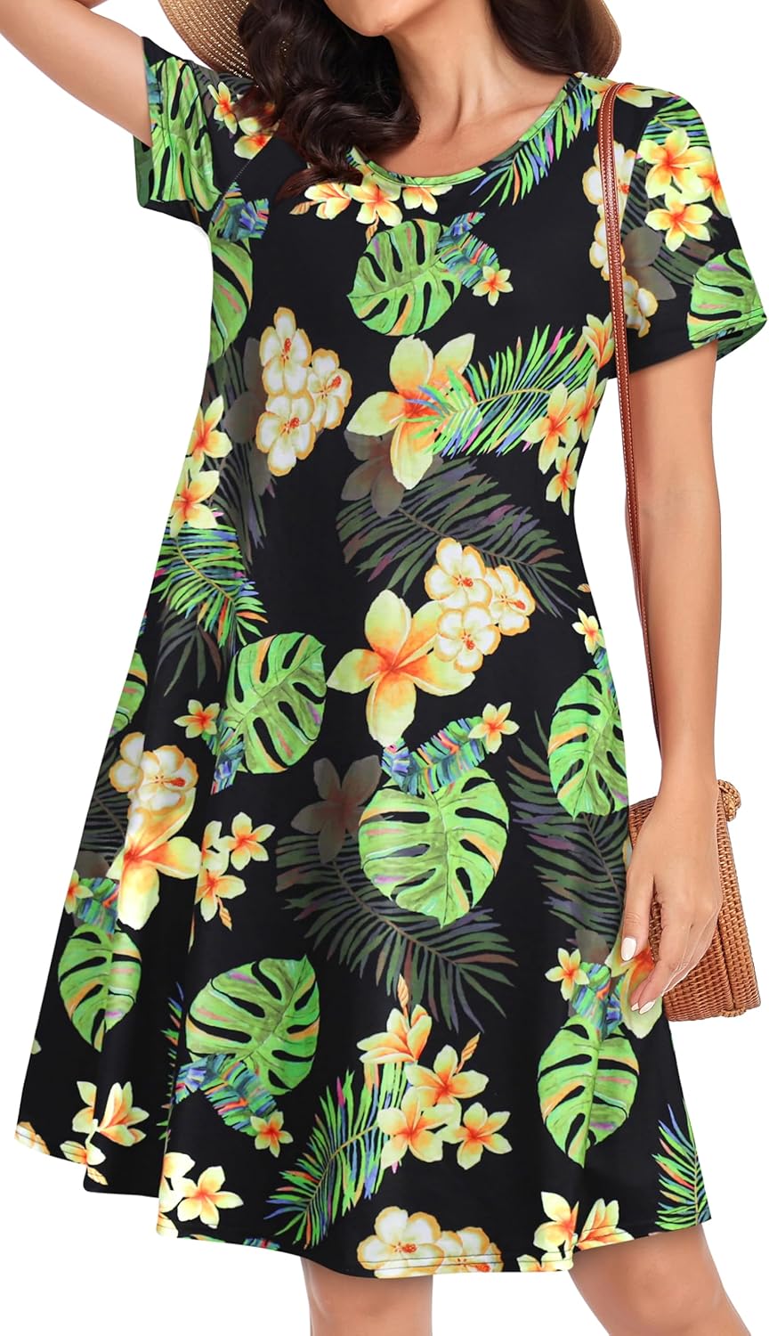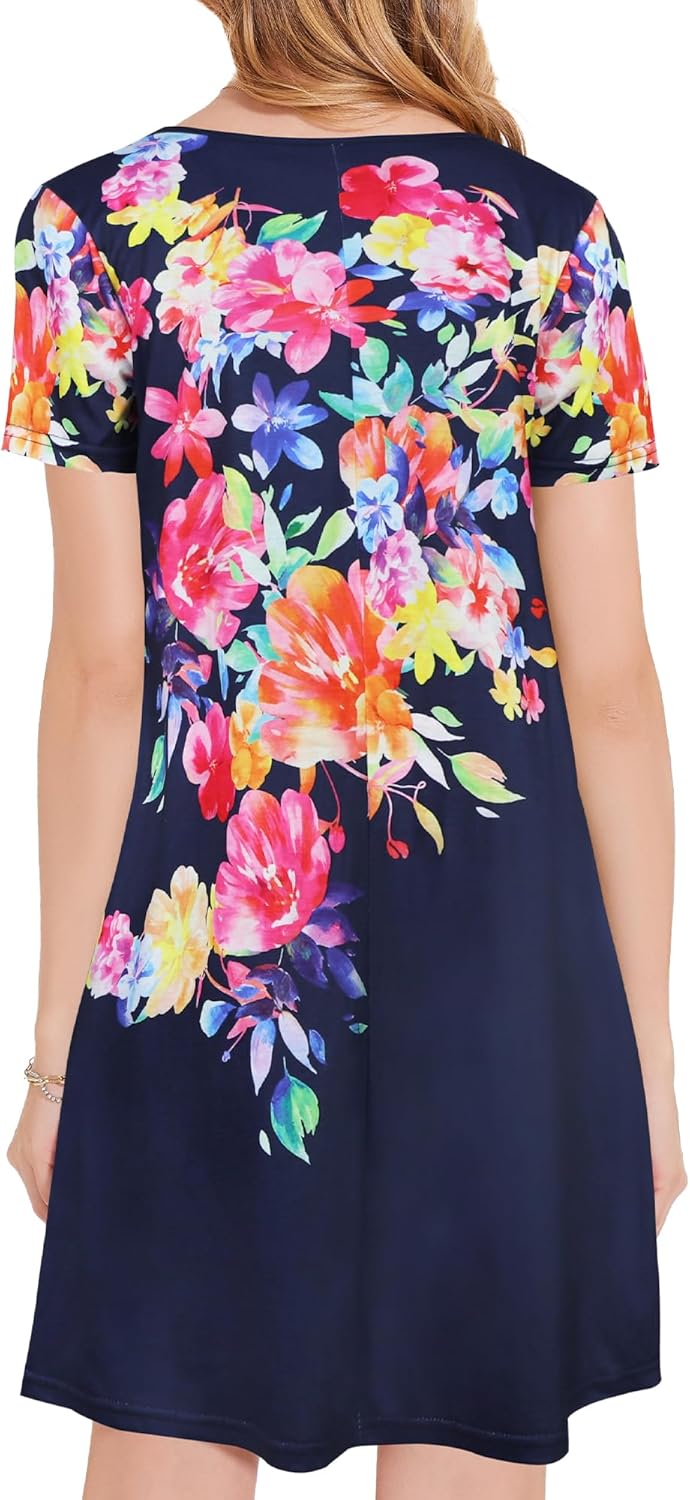 Womens Summer Dresses Beach Casual Loose Tshirt Floral Short Sleeve Flowy Pockets Sundresses