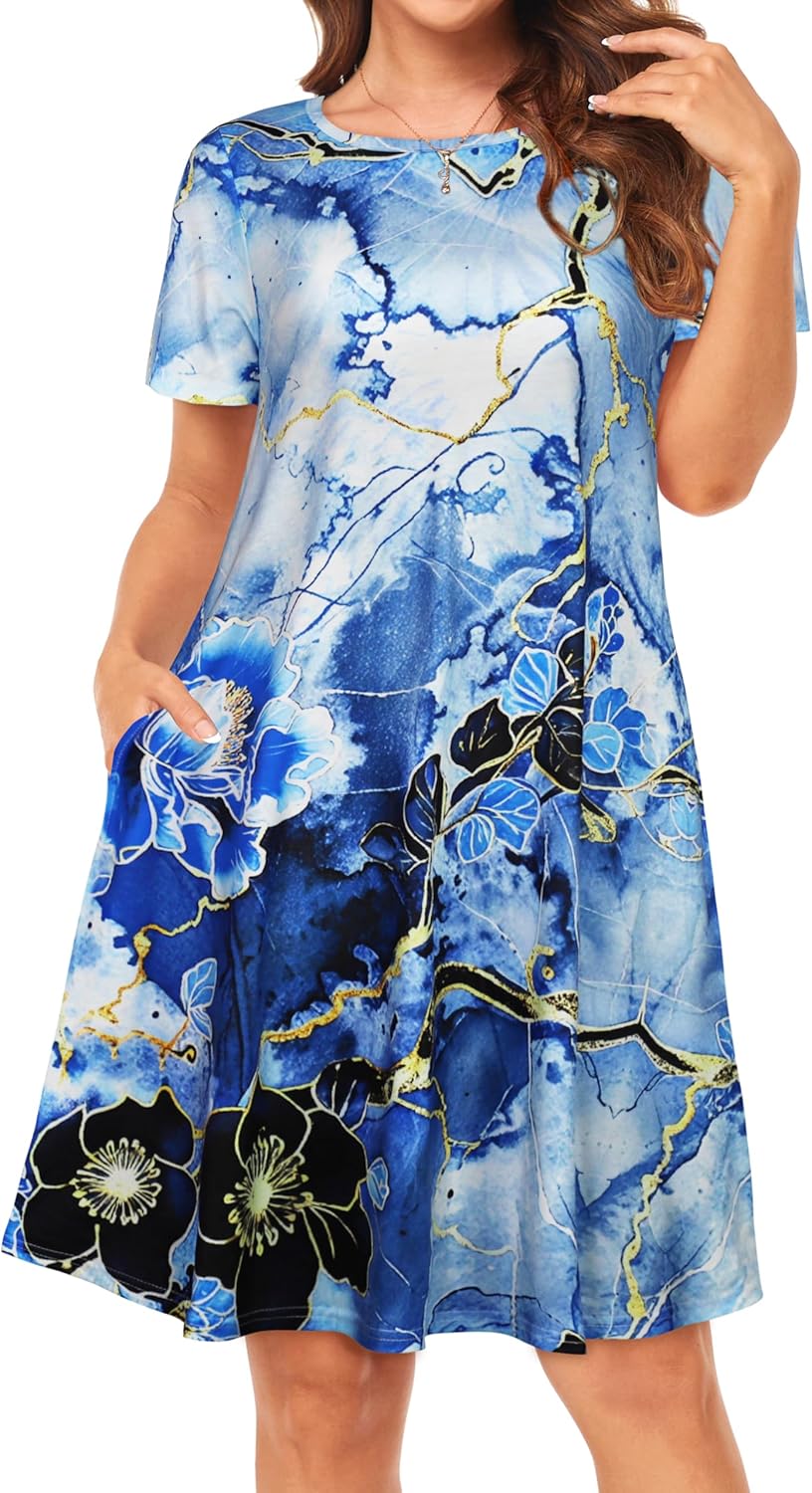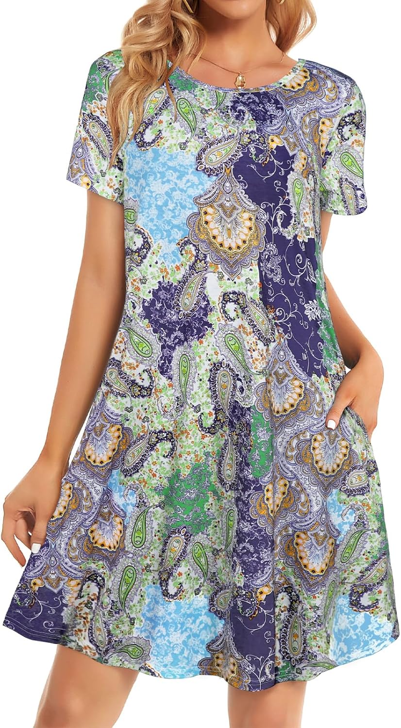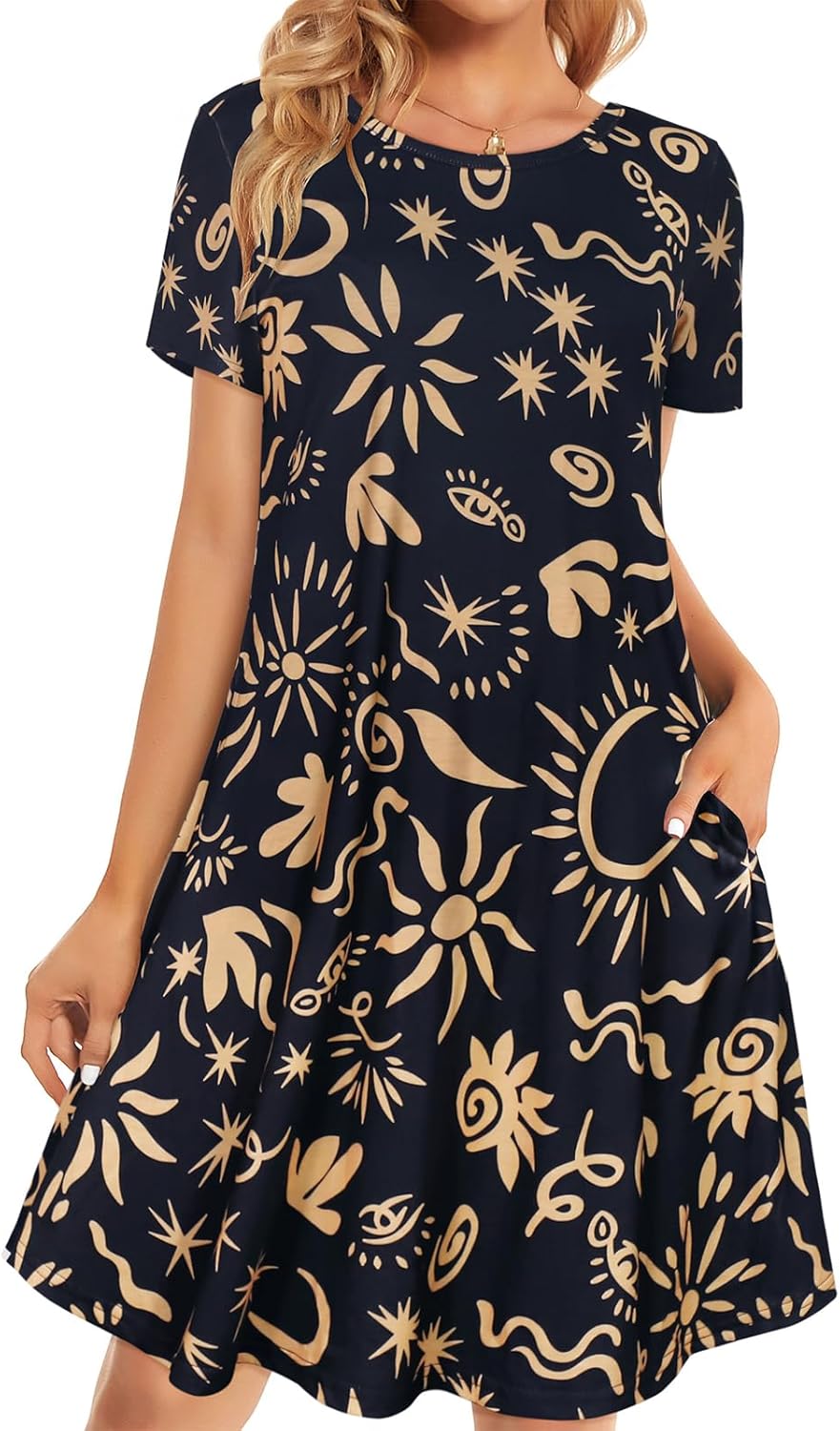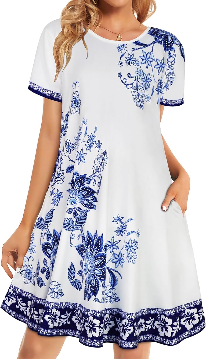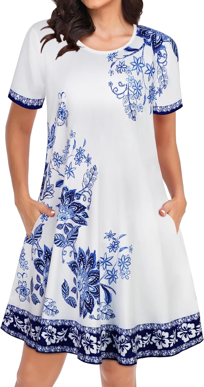Womens Summer Dresses Beach Casual Loose Tshirt Floral Short Sleeve Flowy Pockets Sundresses