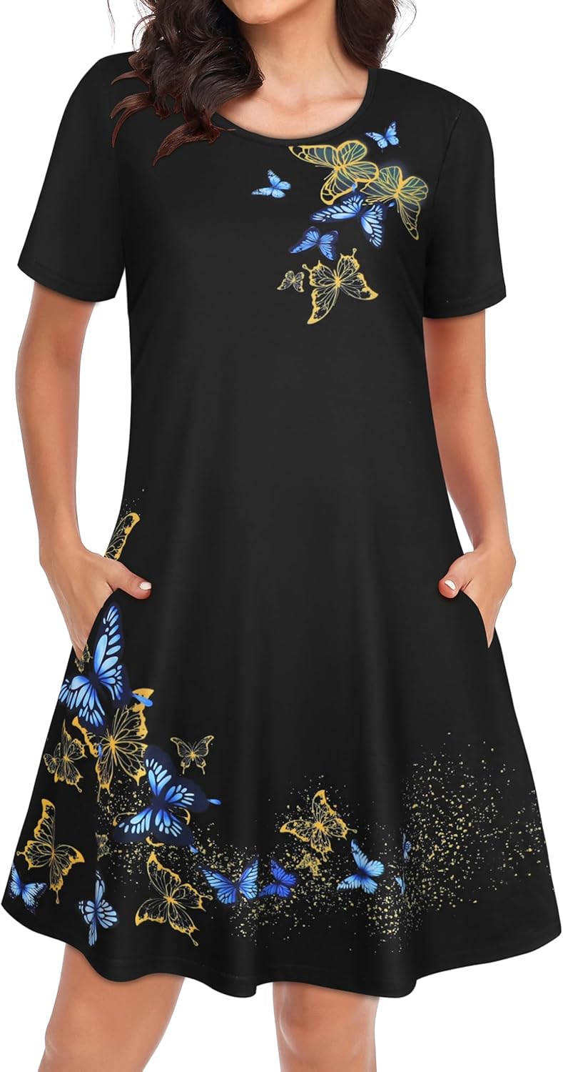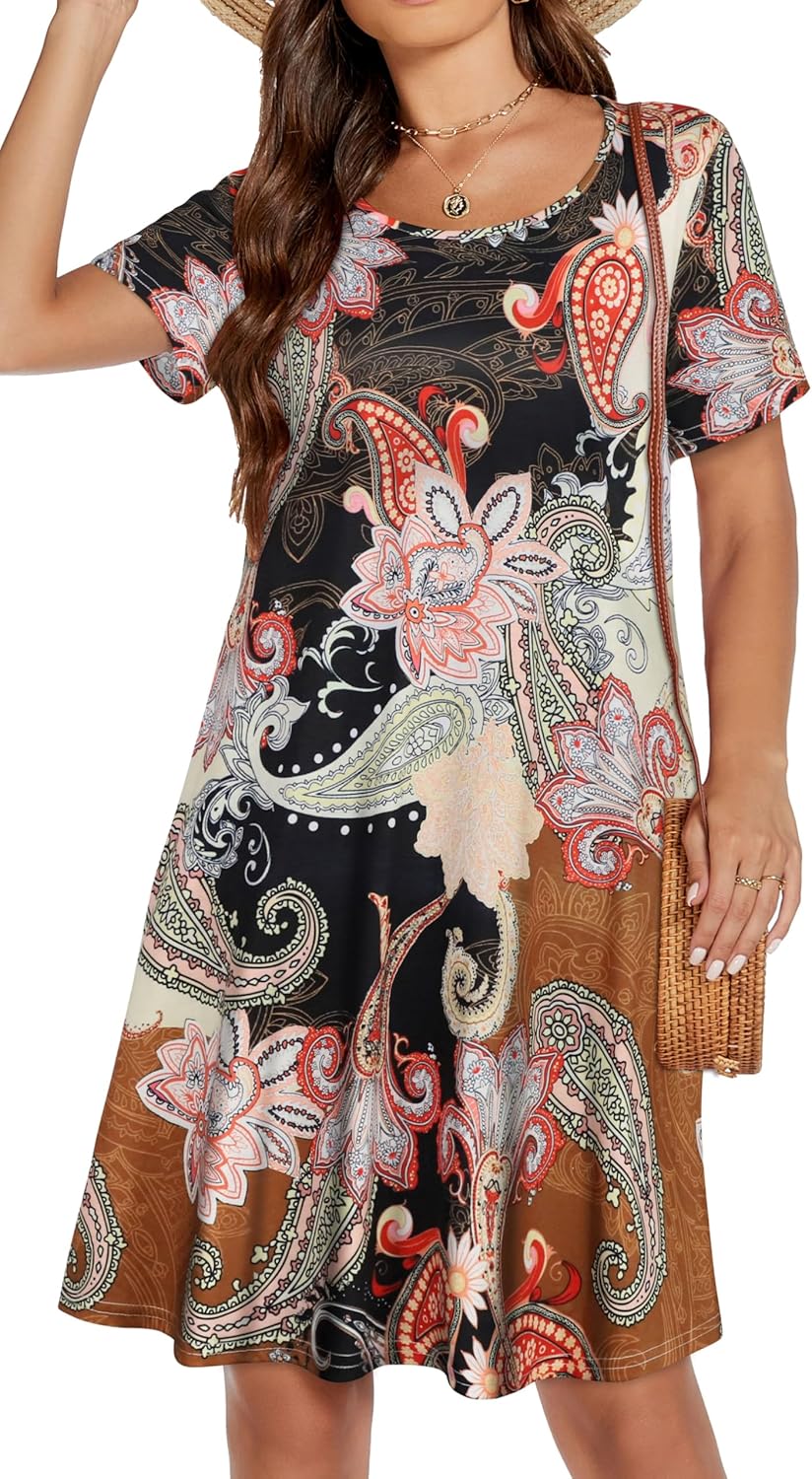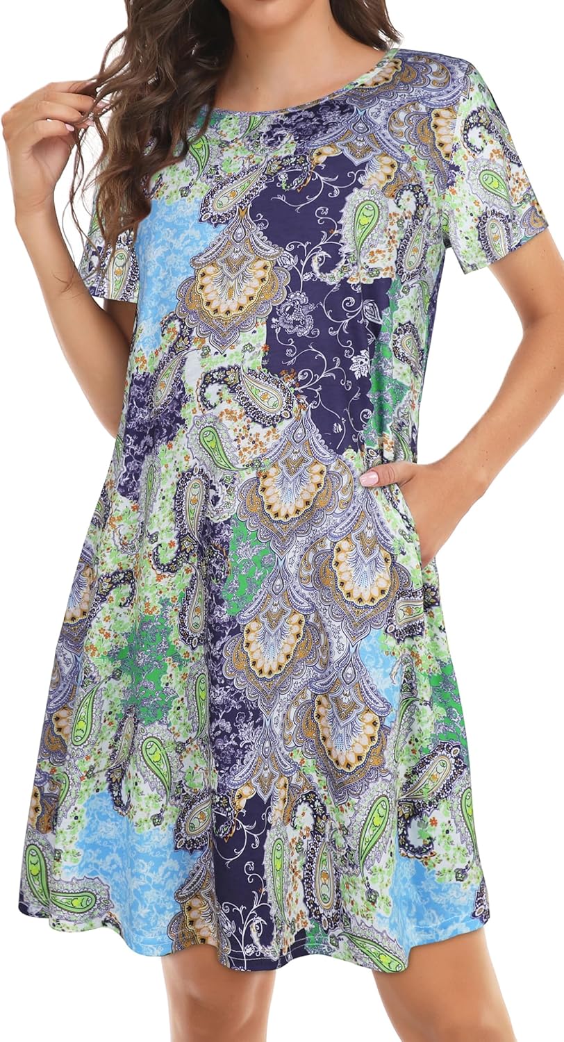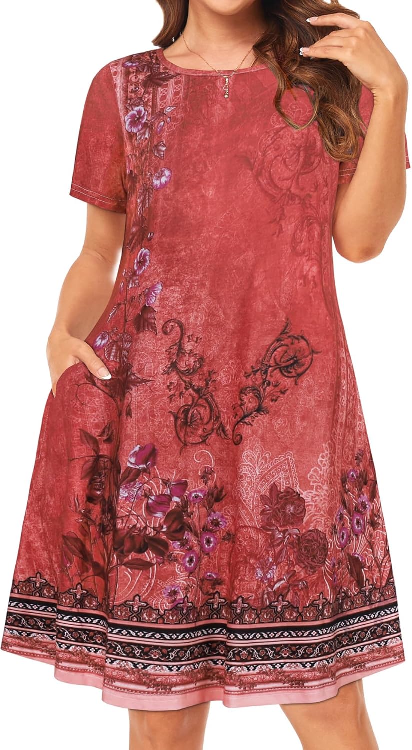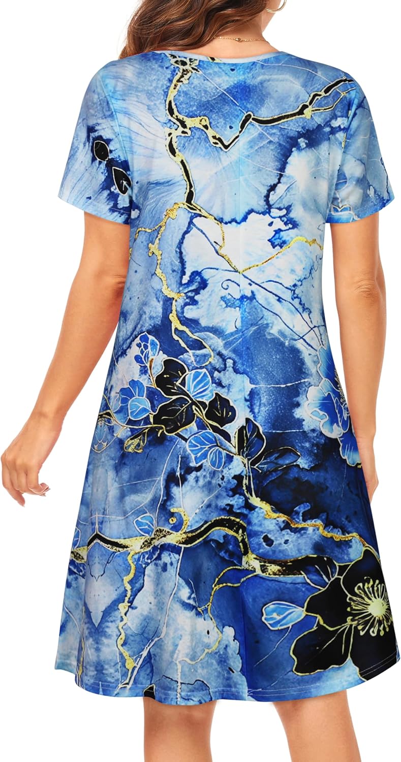 Womens Summer Dresses Beach Casual Loose Tshirt Floral Short Sleeve Flowy Pockets Sundresses