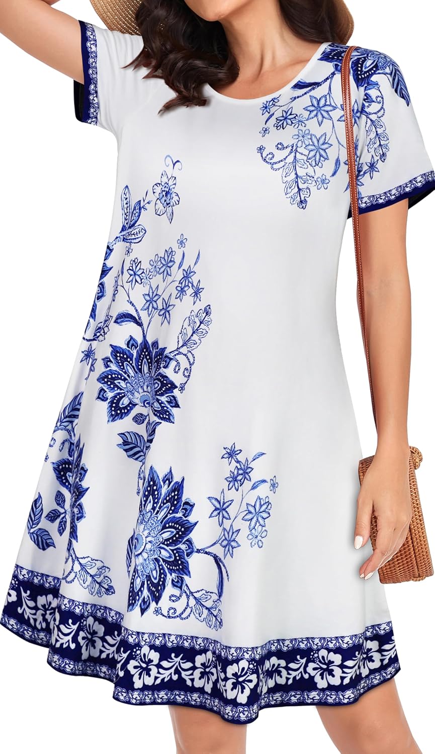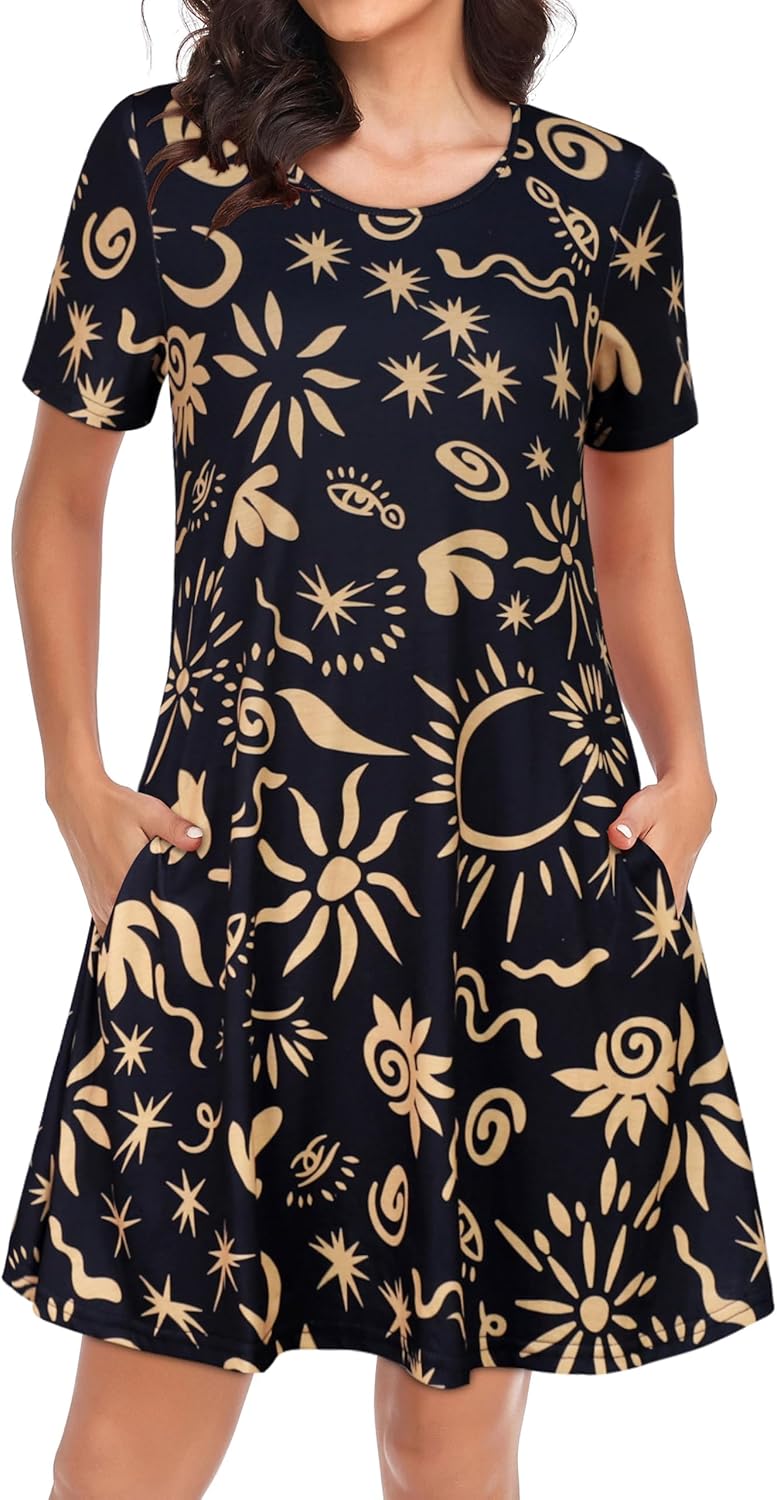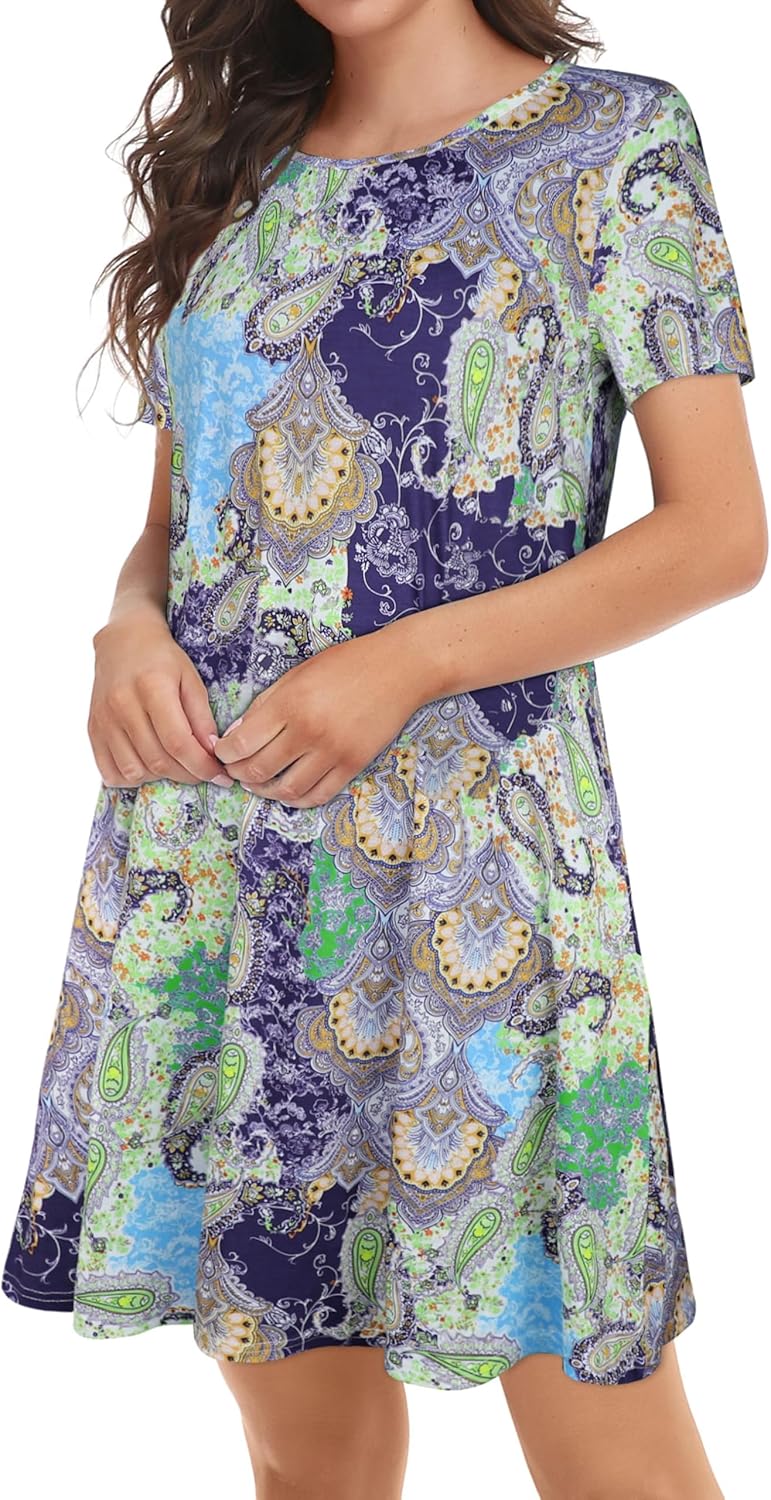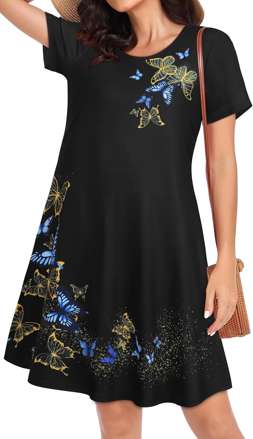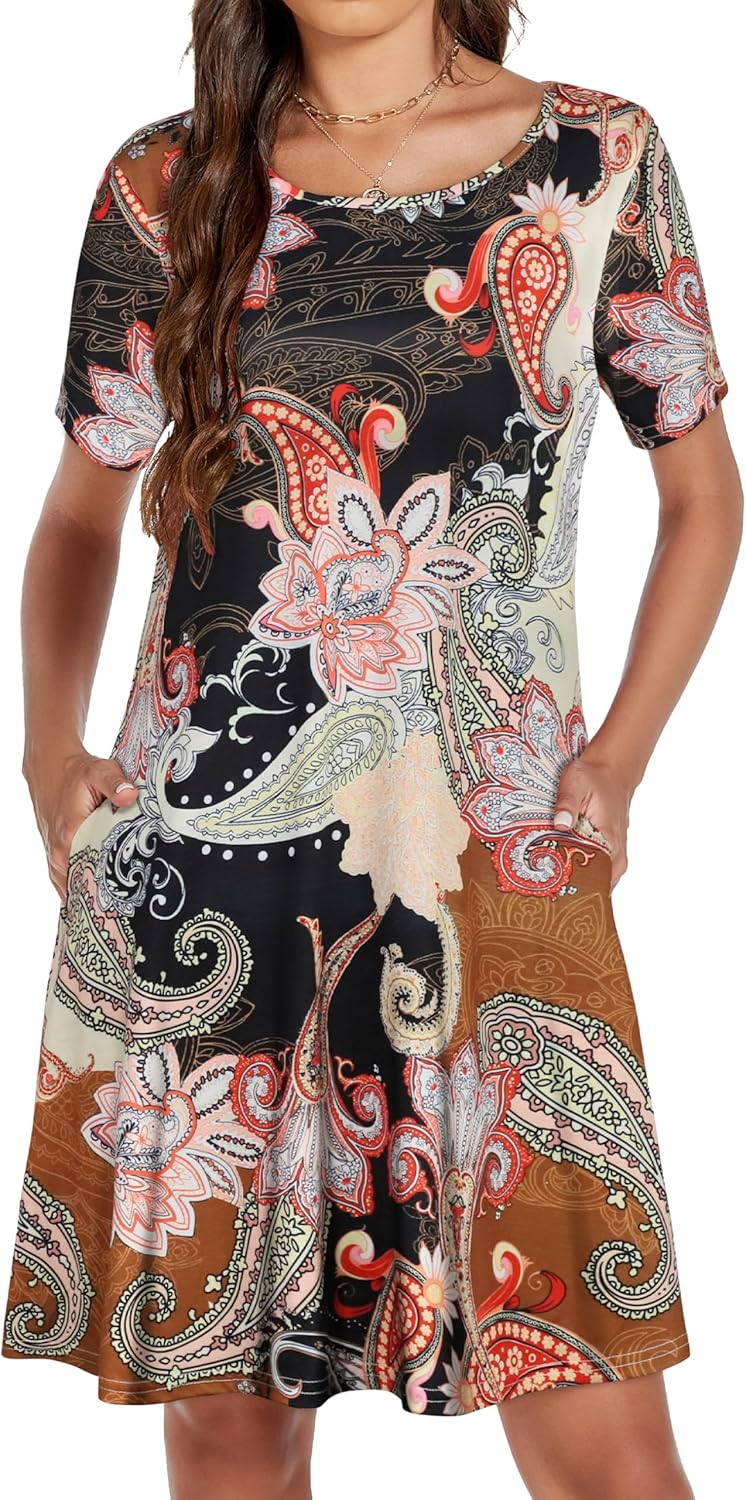 Womens Summer Dresses Beach Casual Loose Tshirt Floral Short Sleeve Flowy Pockets Sundresses