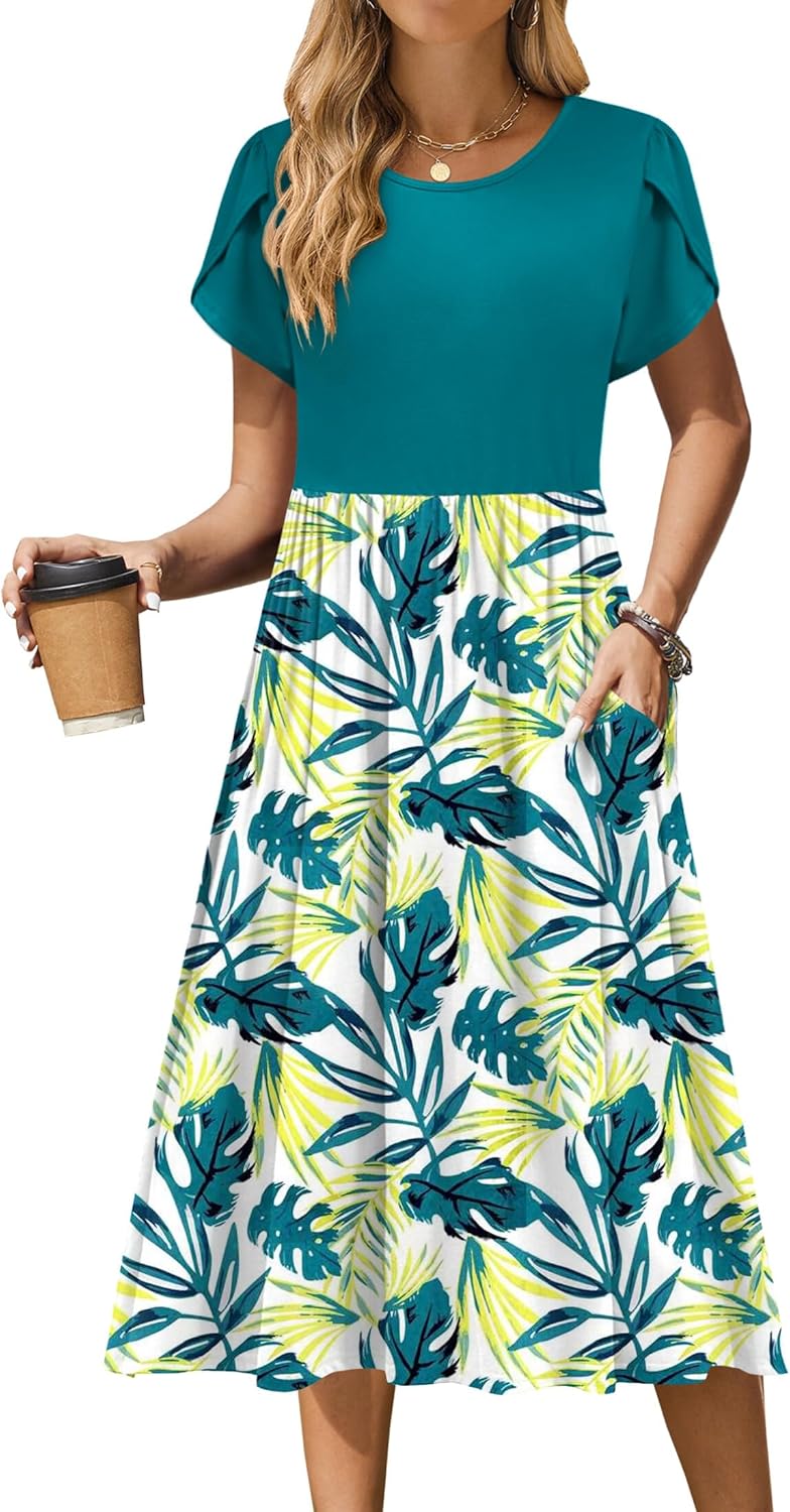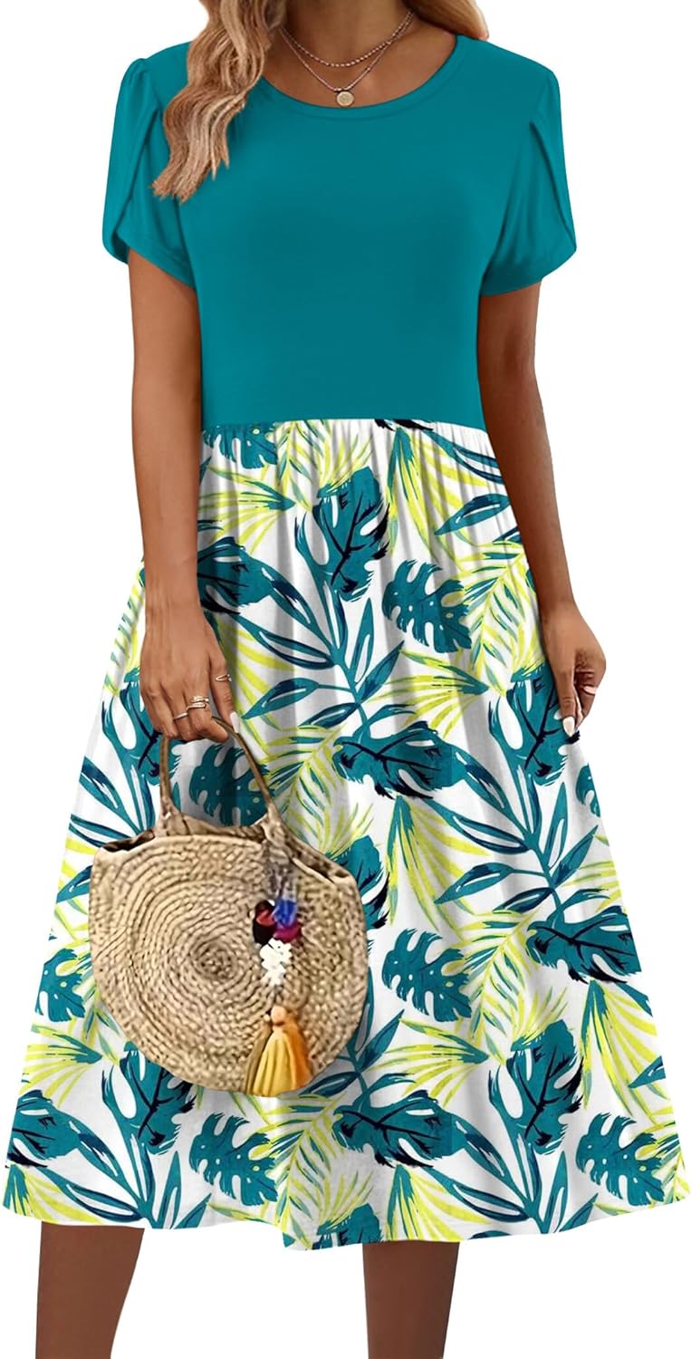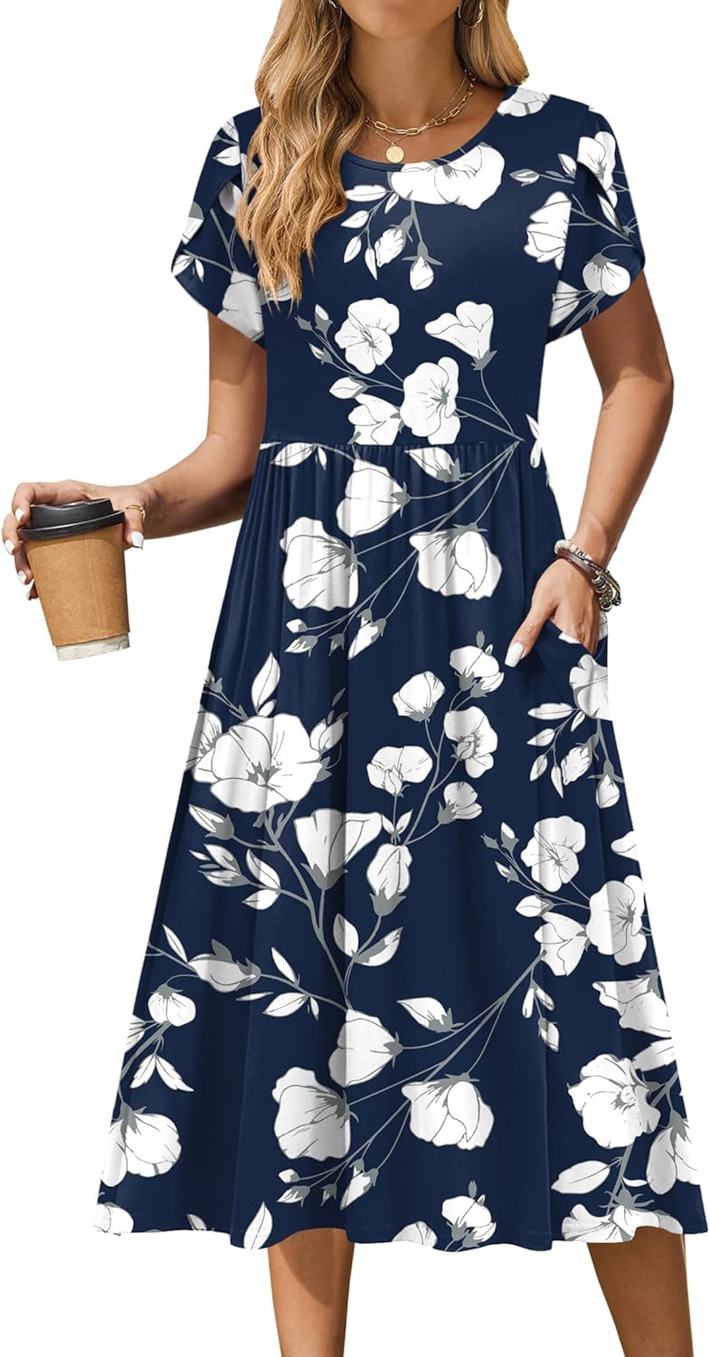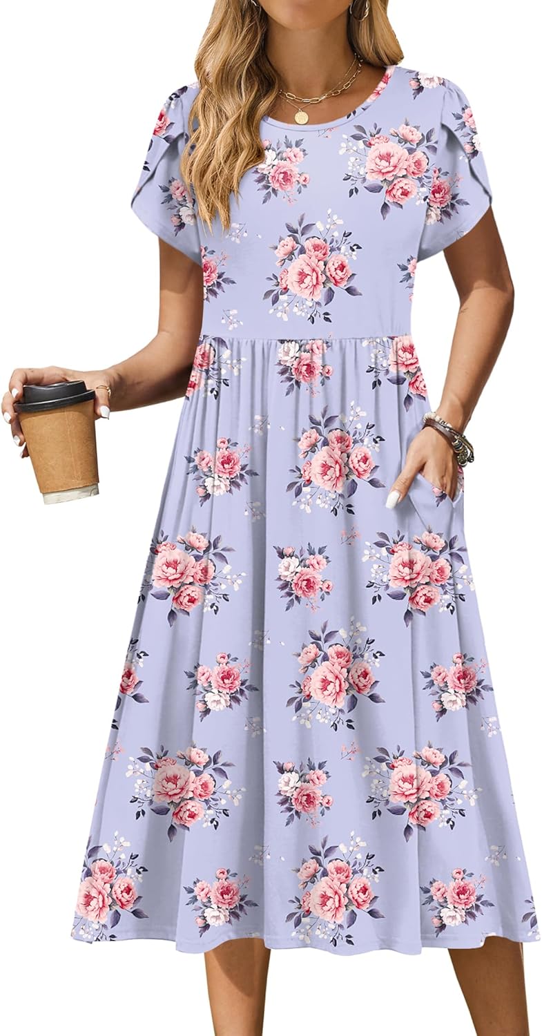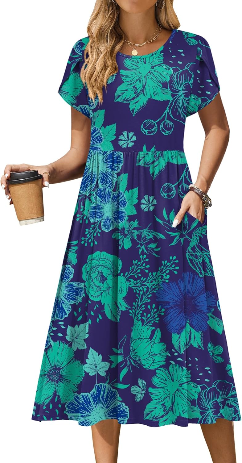 Zeagoo Women Summer Short Sleeve Midi Dress with Pockets Casual Aline Flowy Tshirt Dress Floral Vocation Beach Sundress