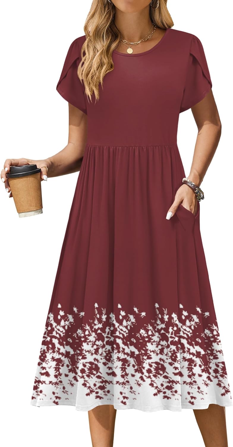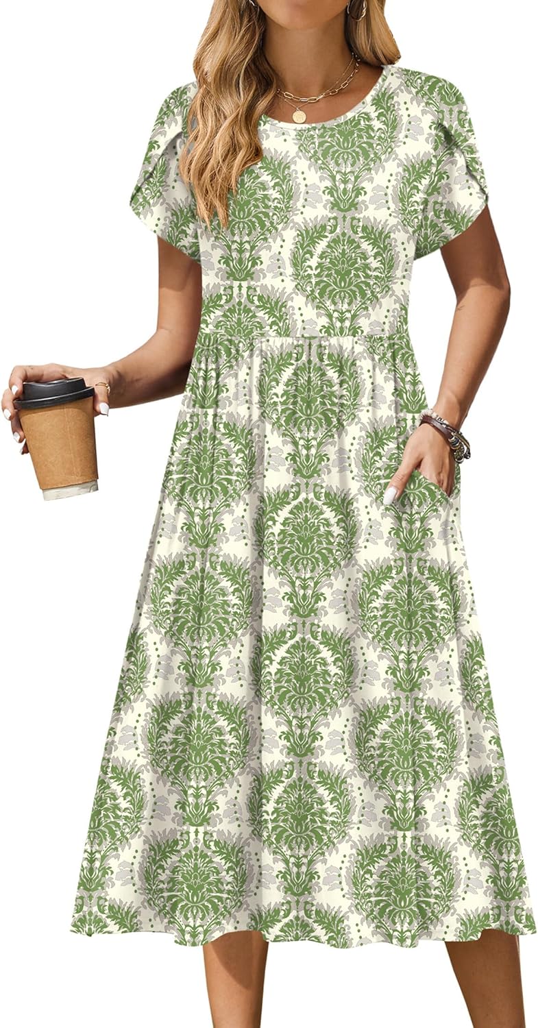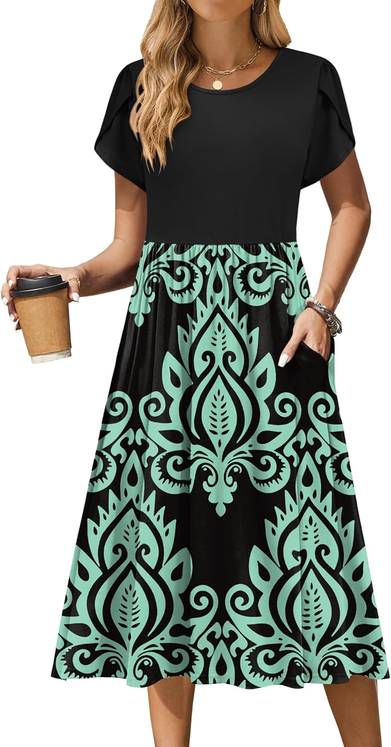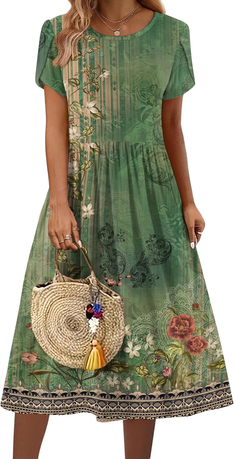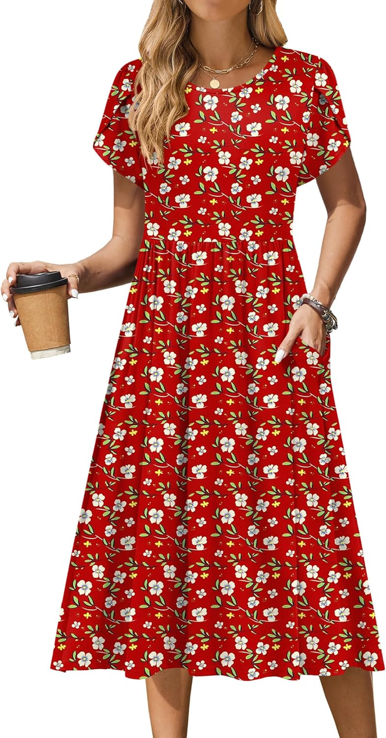 Zeagoo Women Summer Short Sleeve Midi Dress with Pockets Casual Aline Flowy Tshirt Dress Floral Vocation Beach Sundress