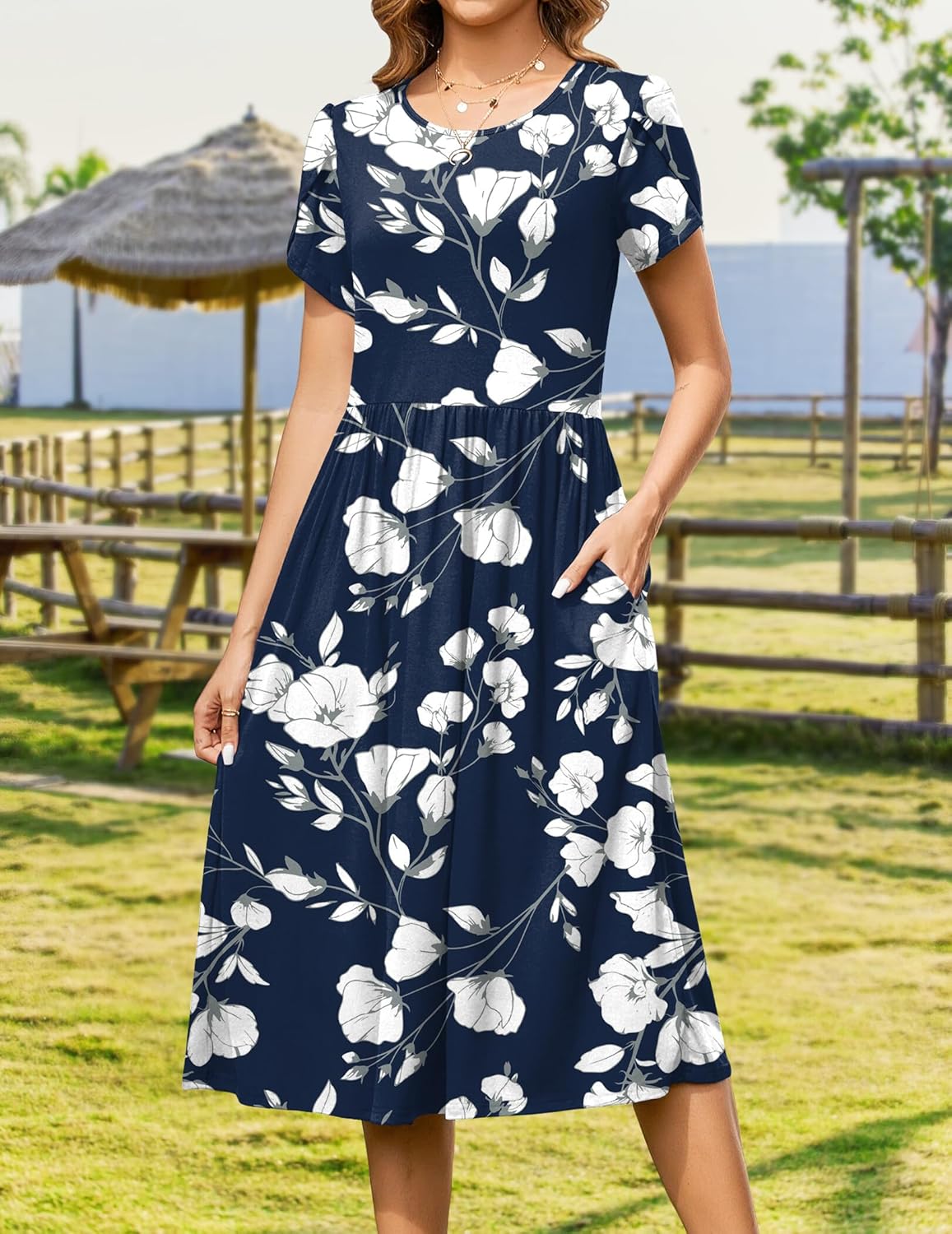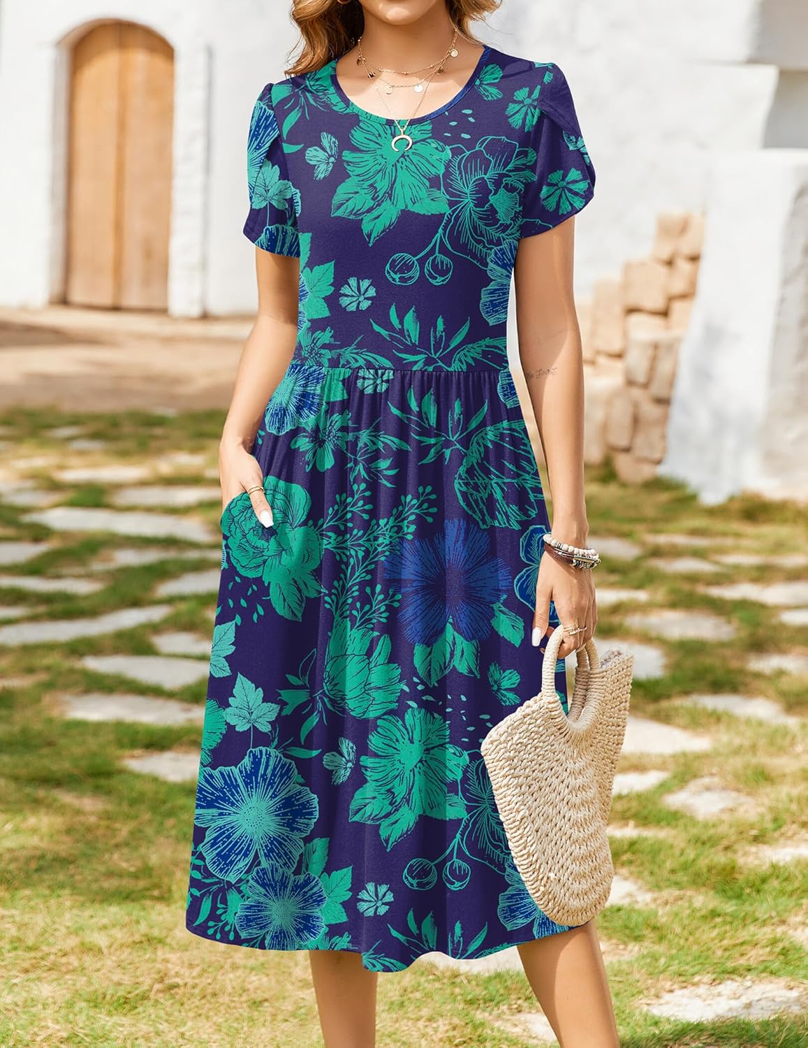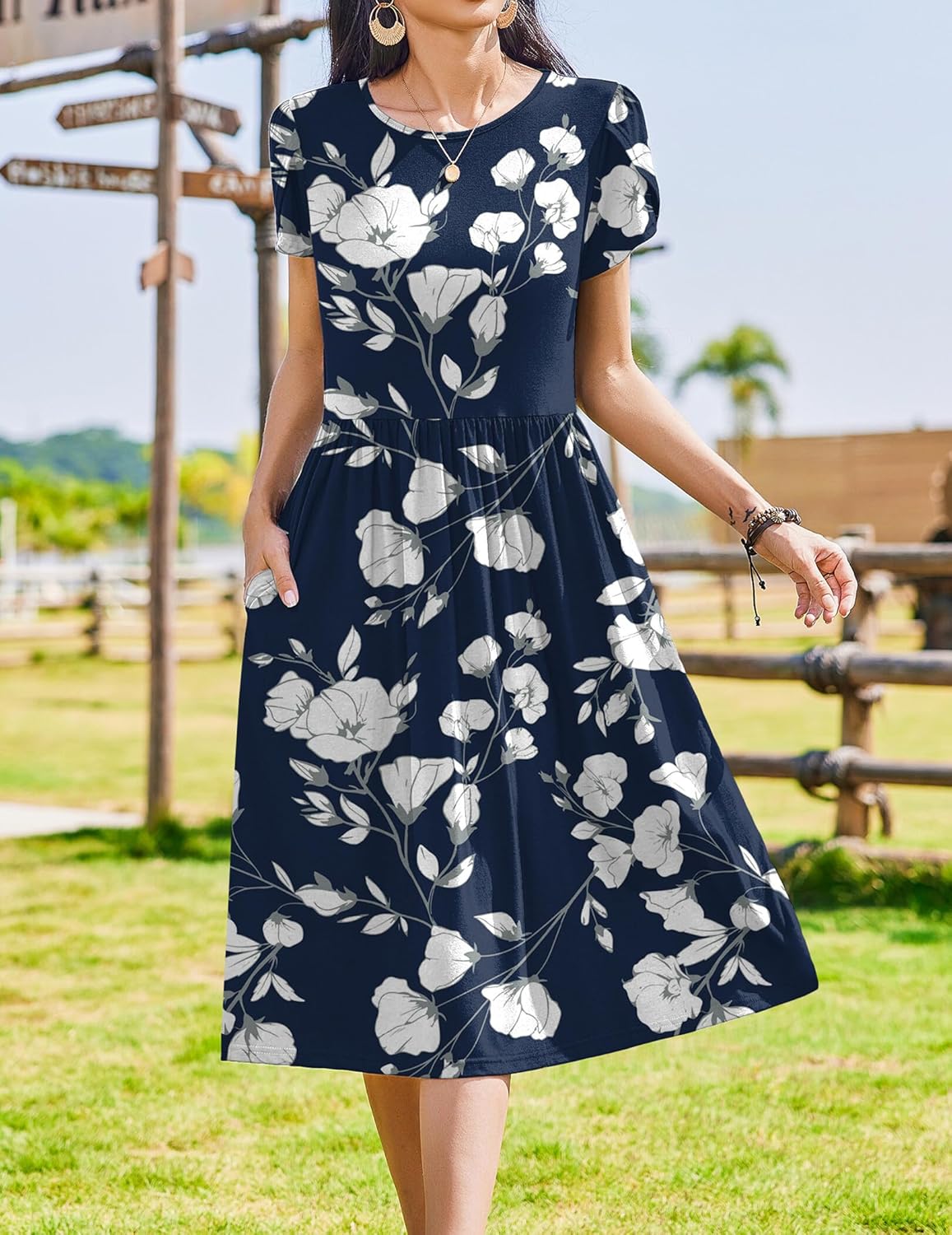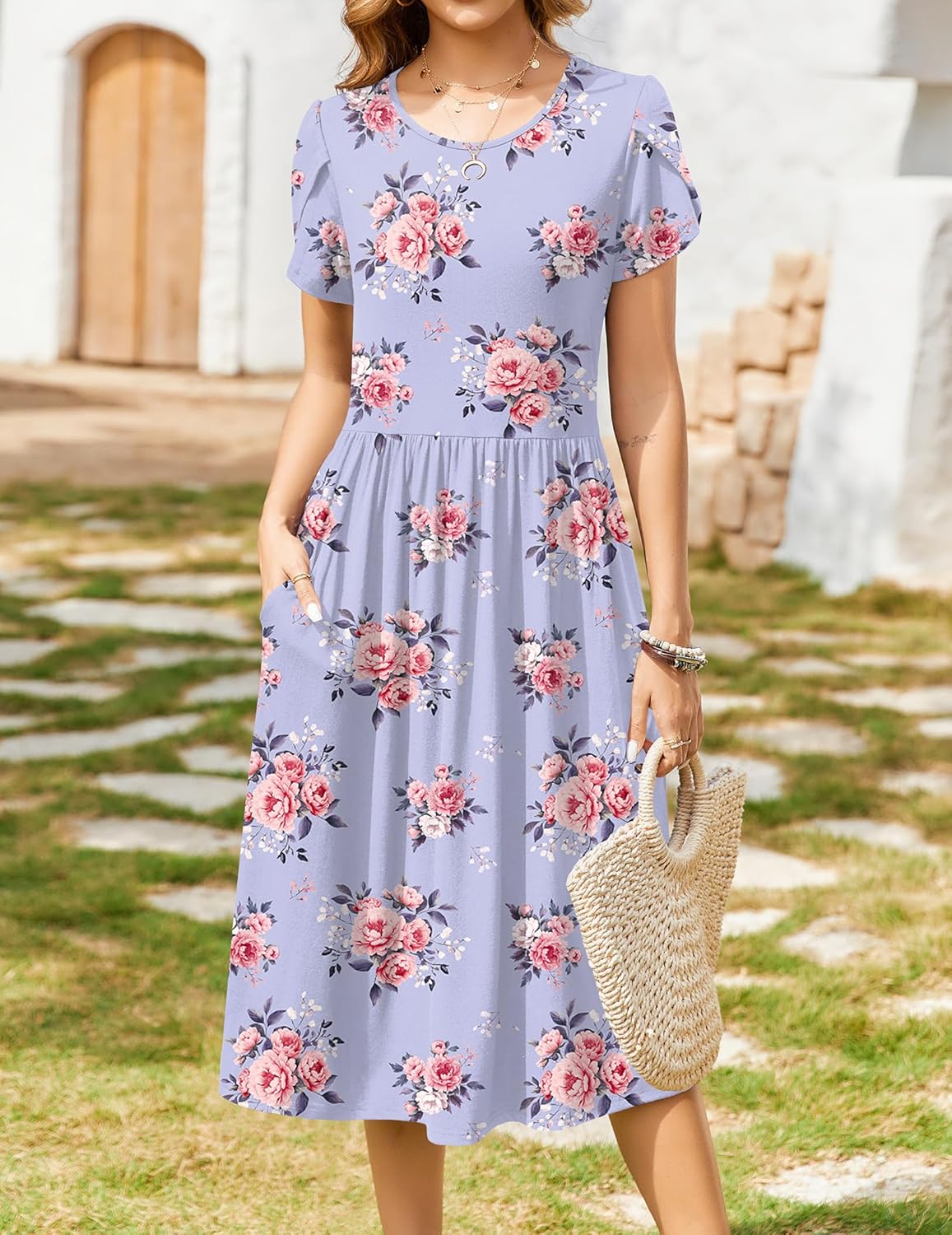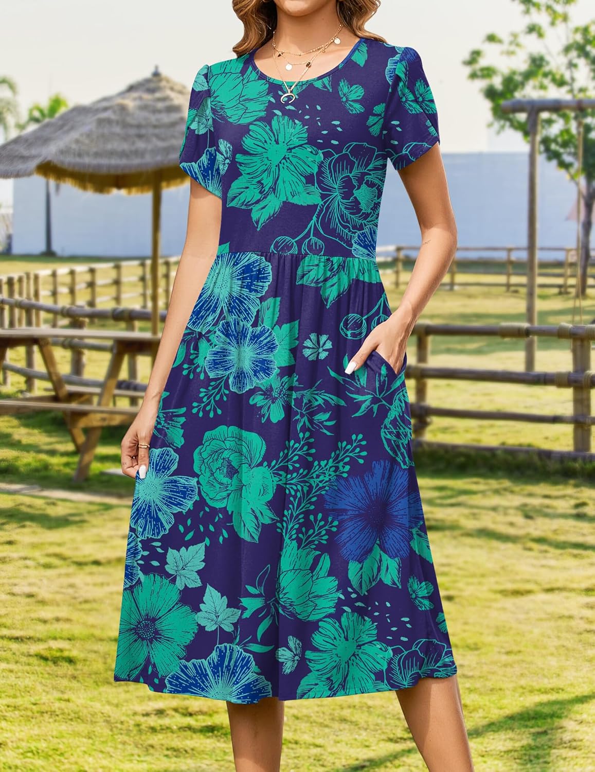 Zeagoo Women Summer Short Sleeve Midi Dress with Pockets Casual Aline Flowy Tshirt Dress Floral Vocation Beach Sundress