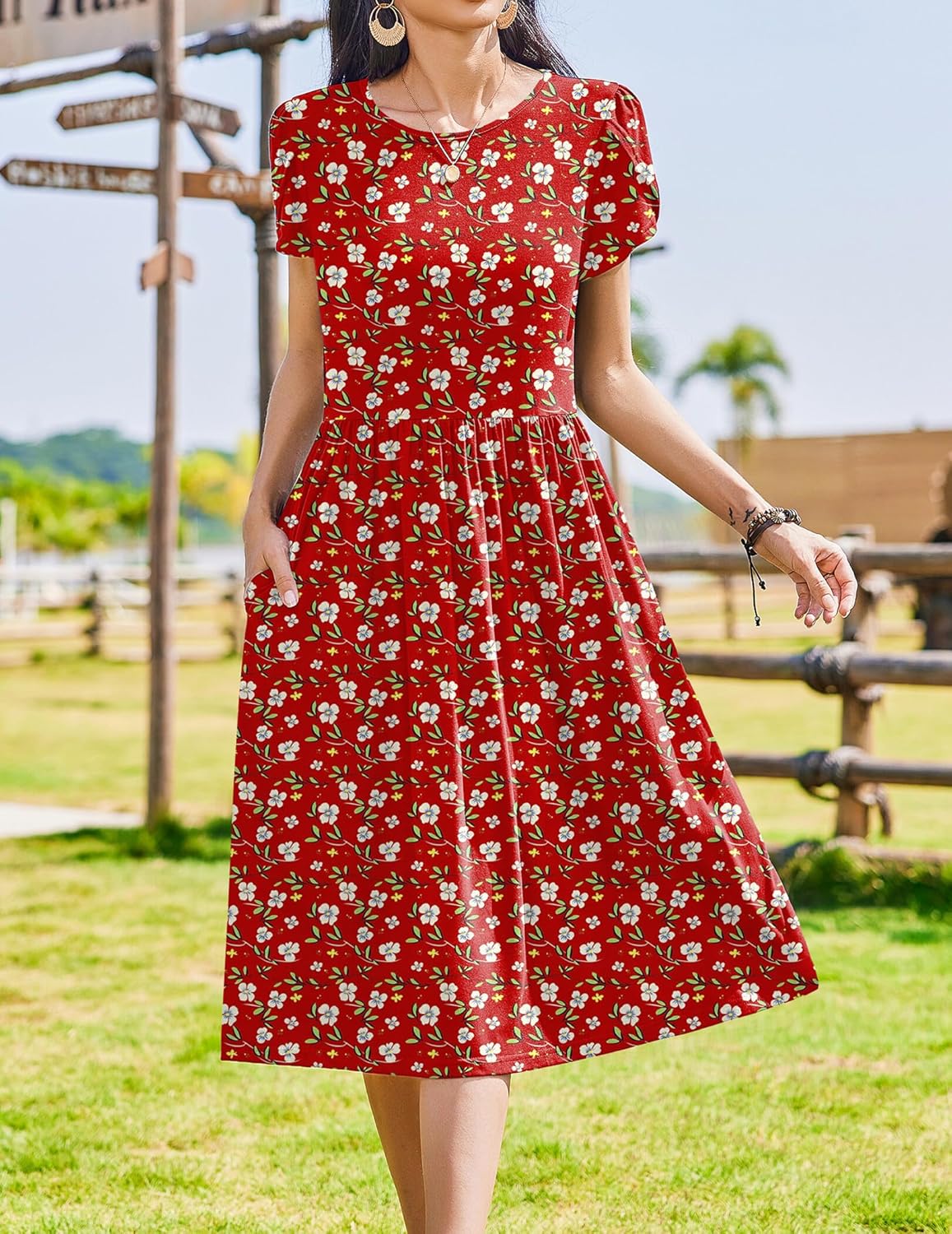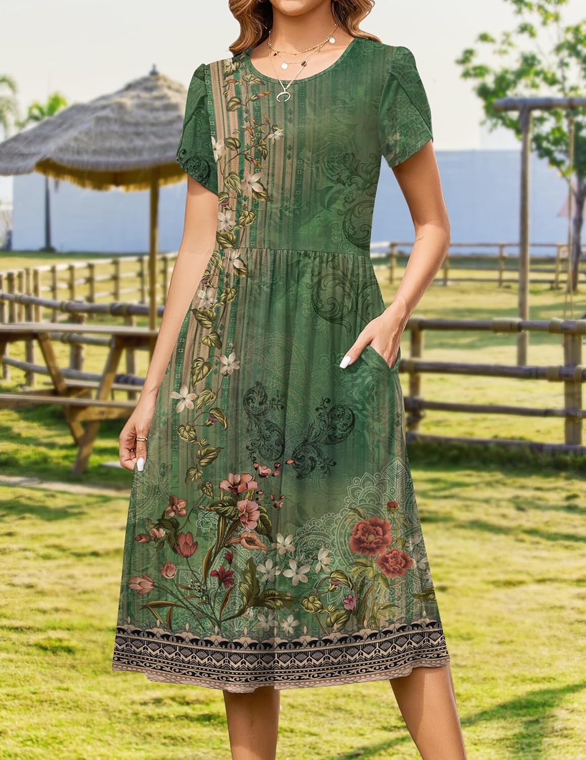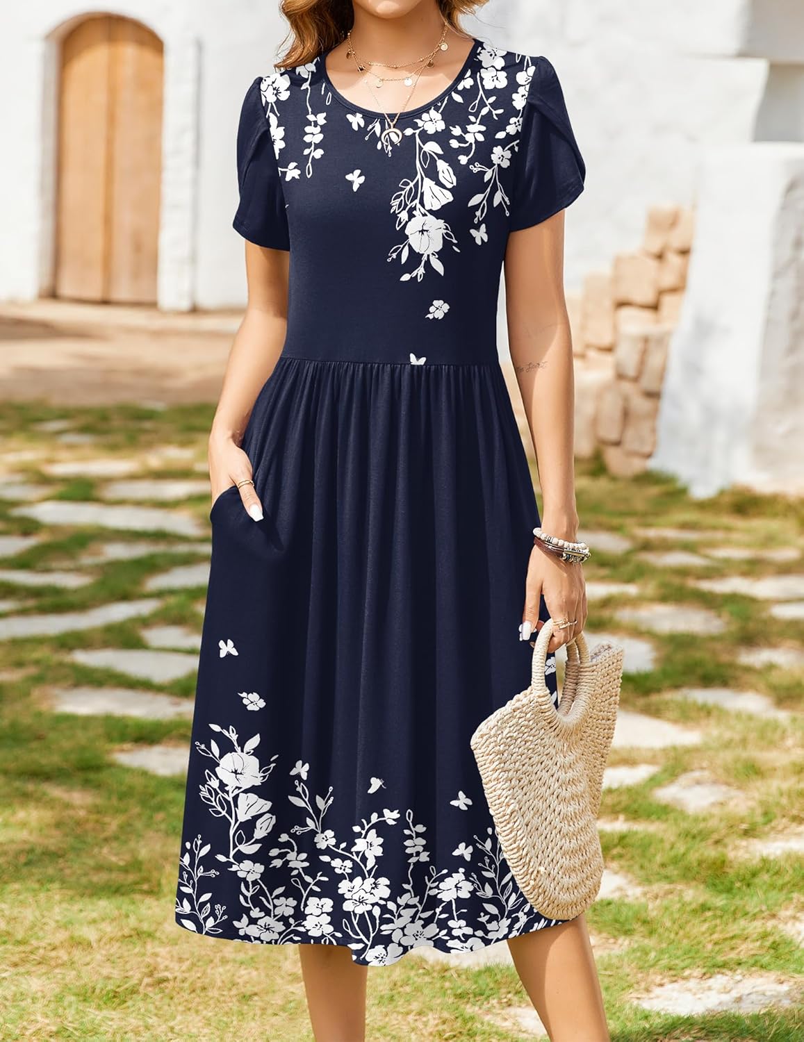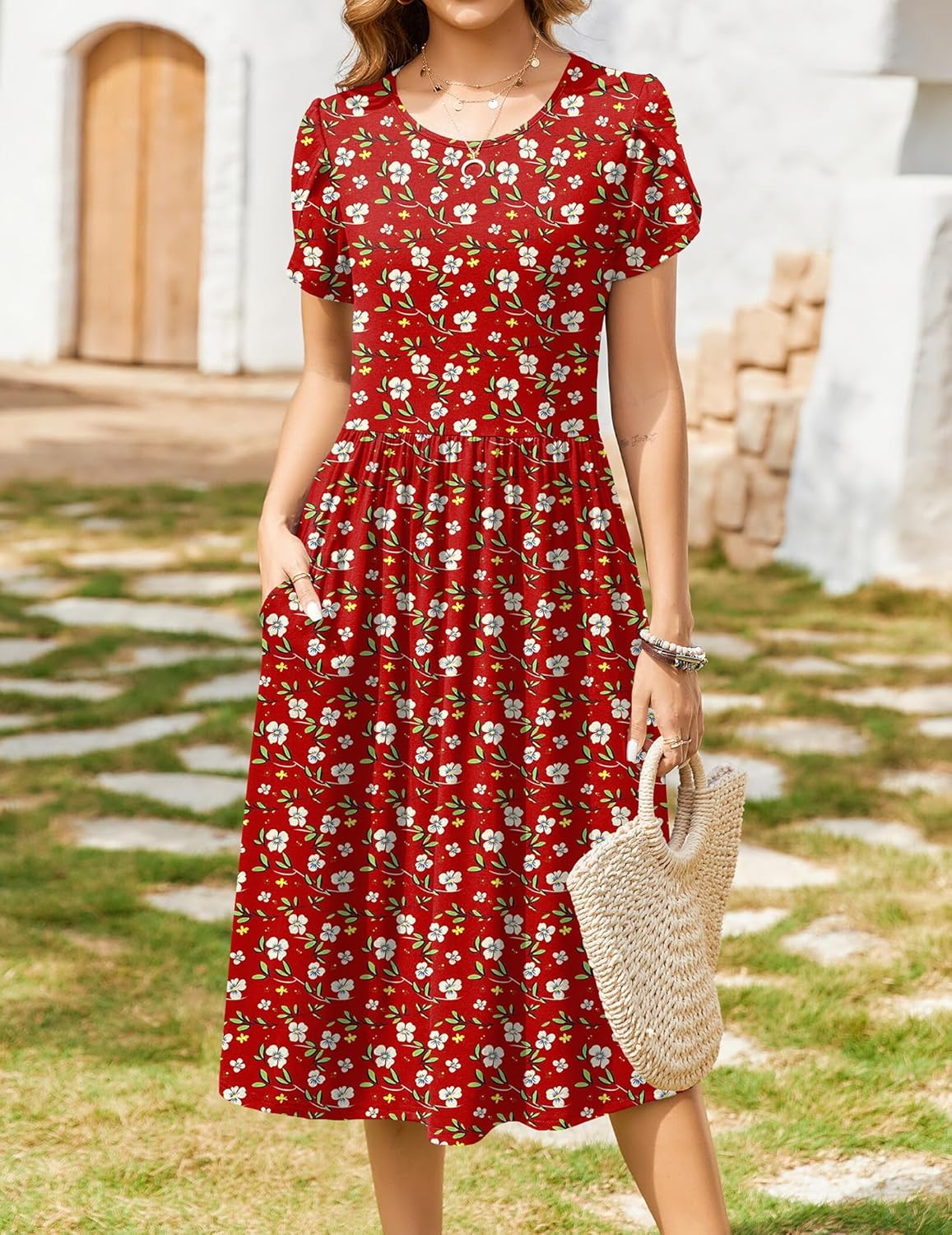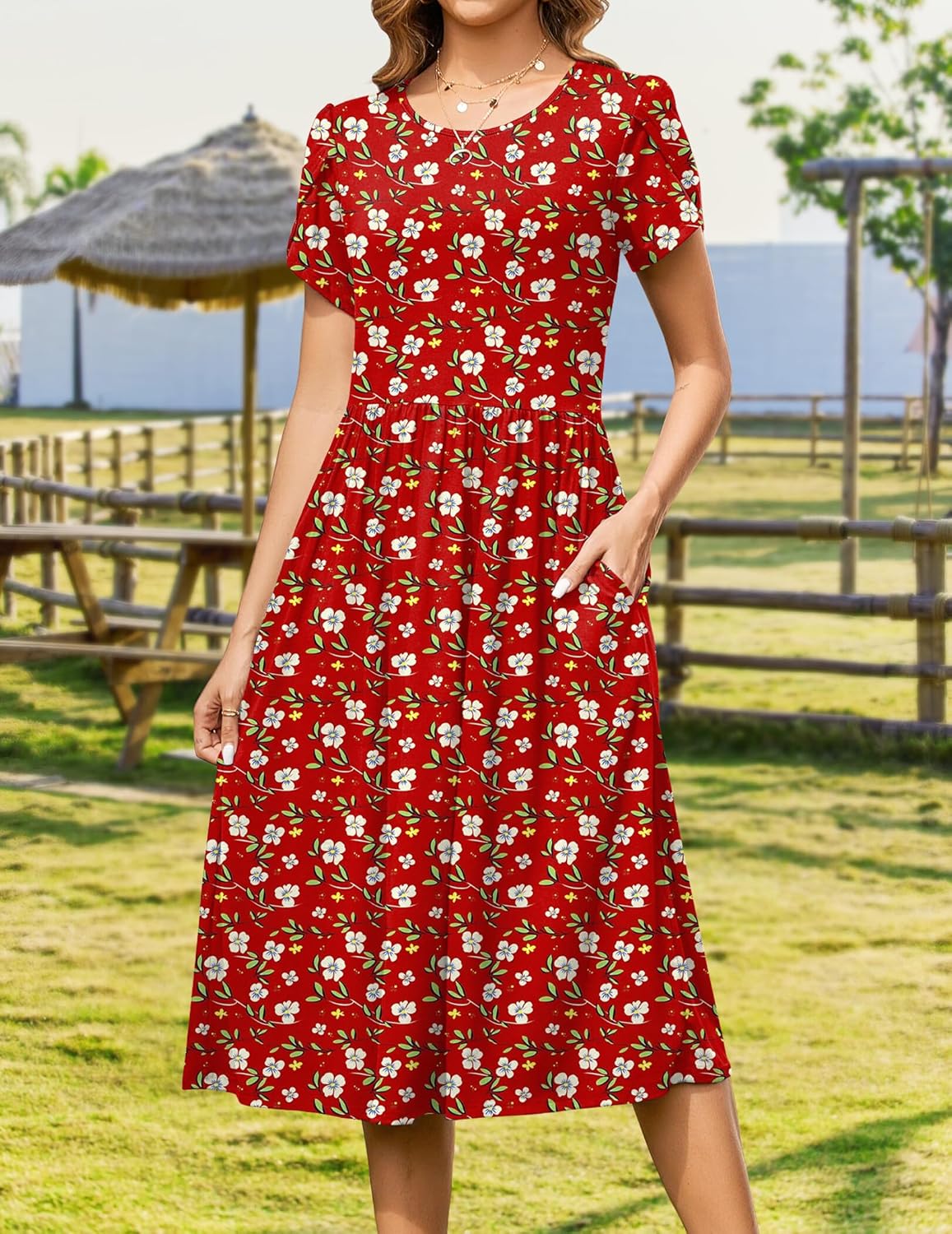 Zeagoo Women Summer Short Sleeve Midi Dress with Pockets Casual Aline Flowy Tshirt Dress Floral Vocation Beach Sundress