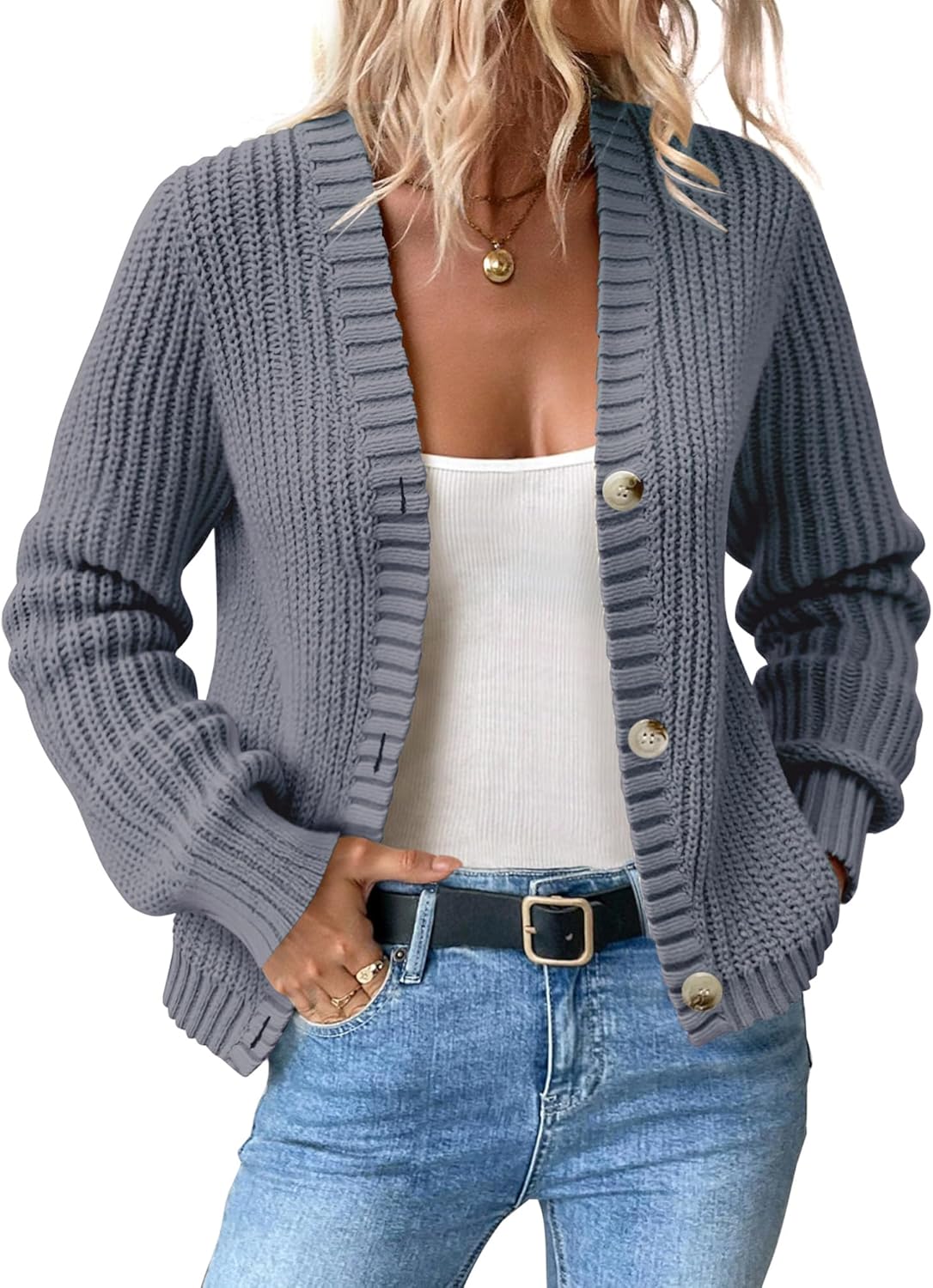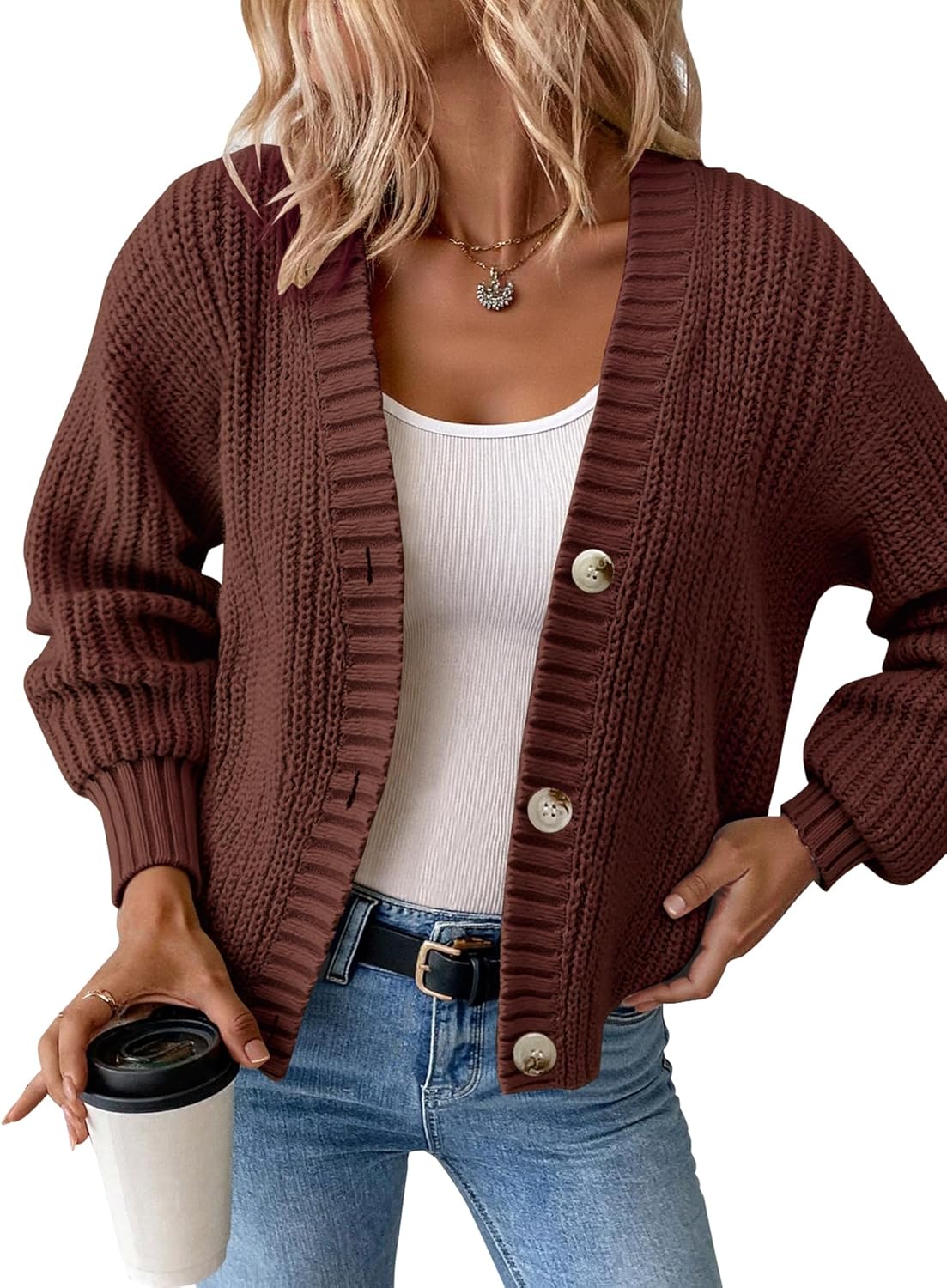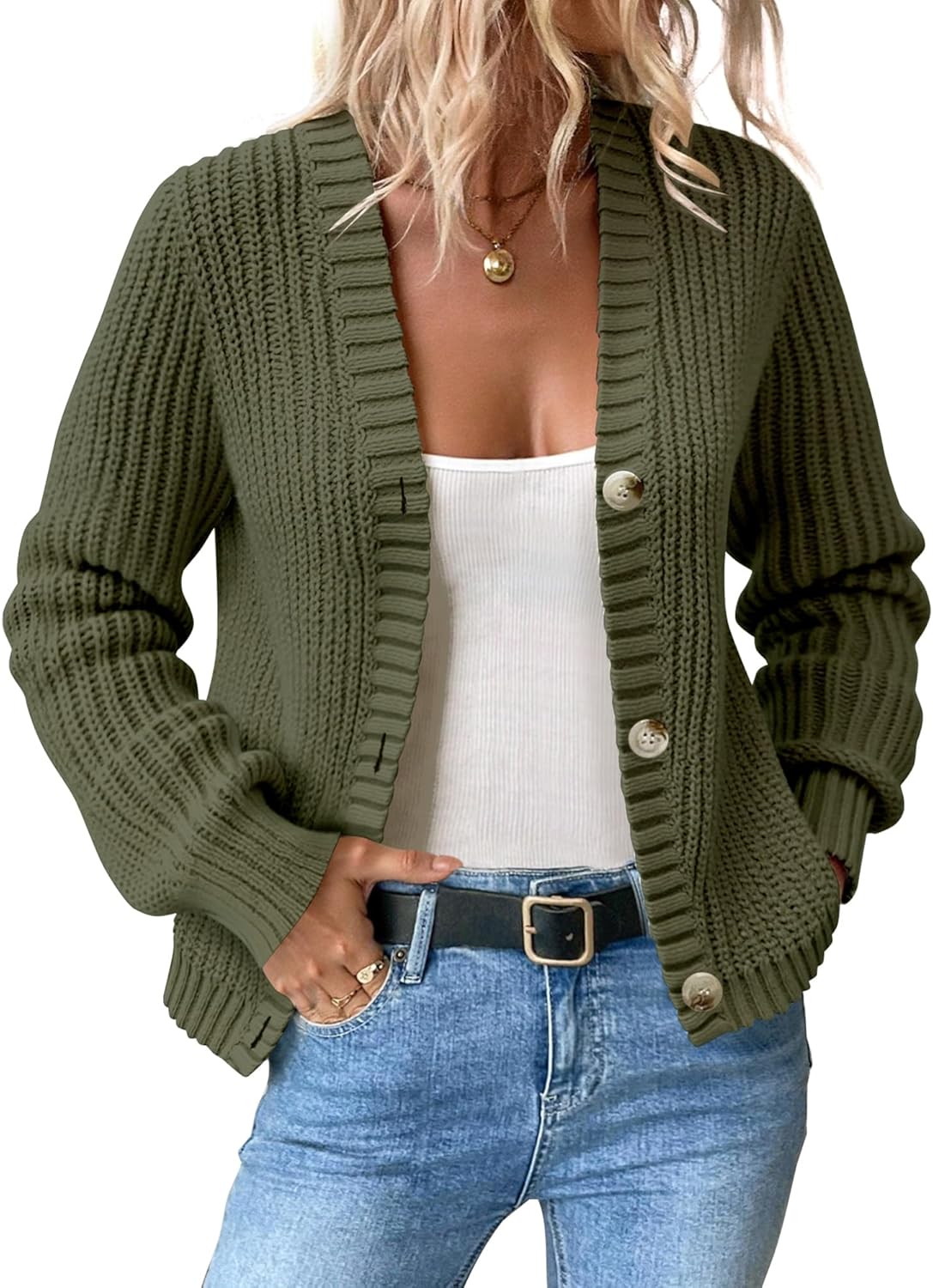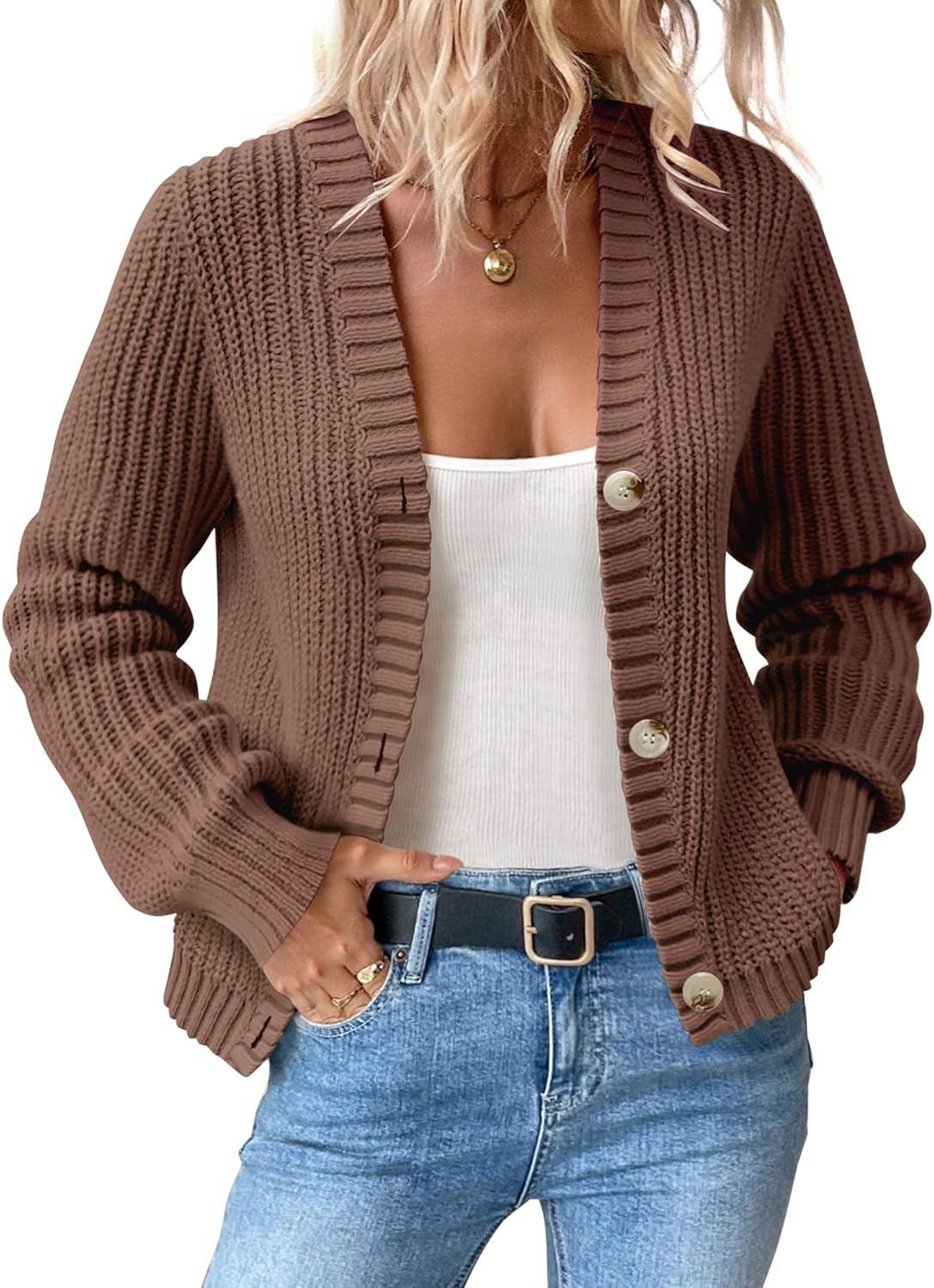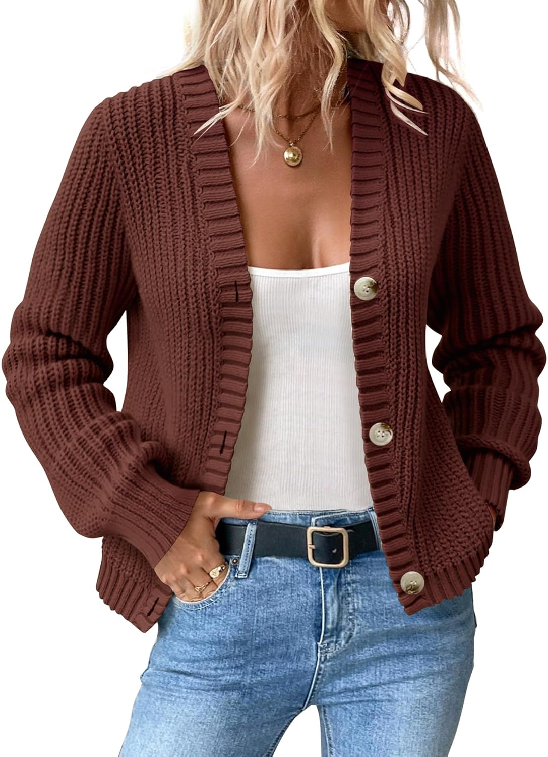 Women’s Chunky Knit Cardigan – Waffle Knit Button Down Oversized V Neck Fall Sweater for Casual Layering