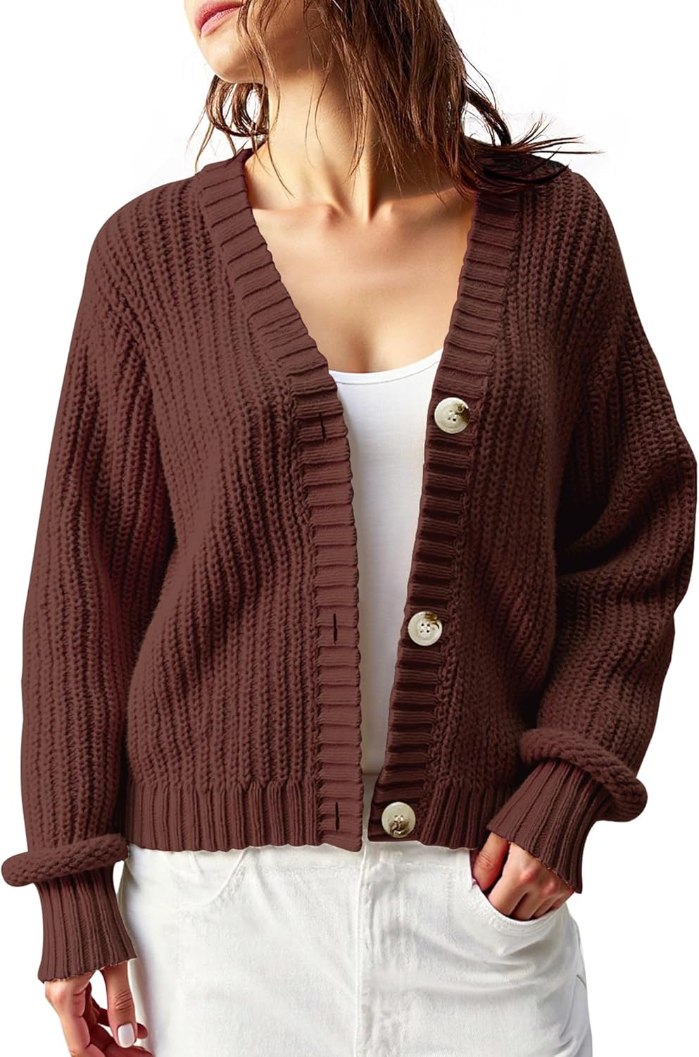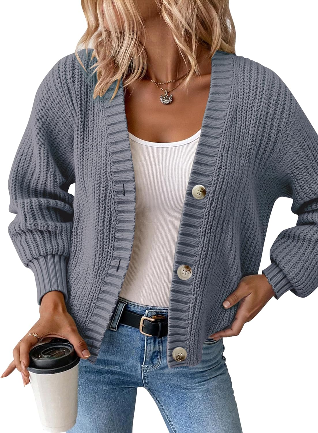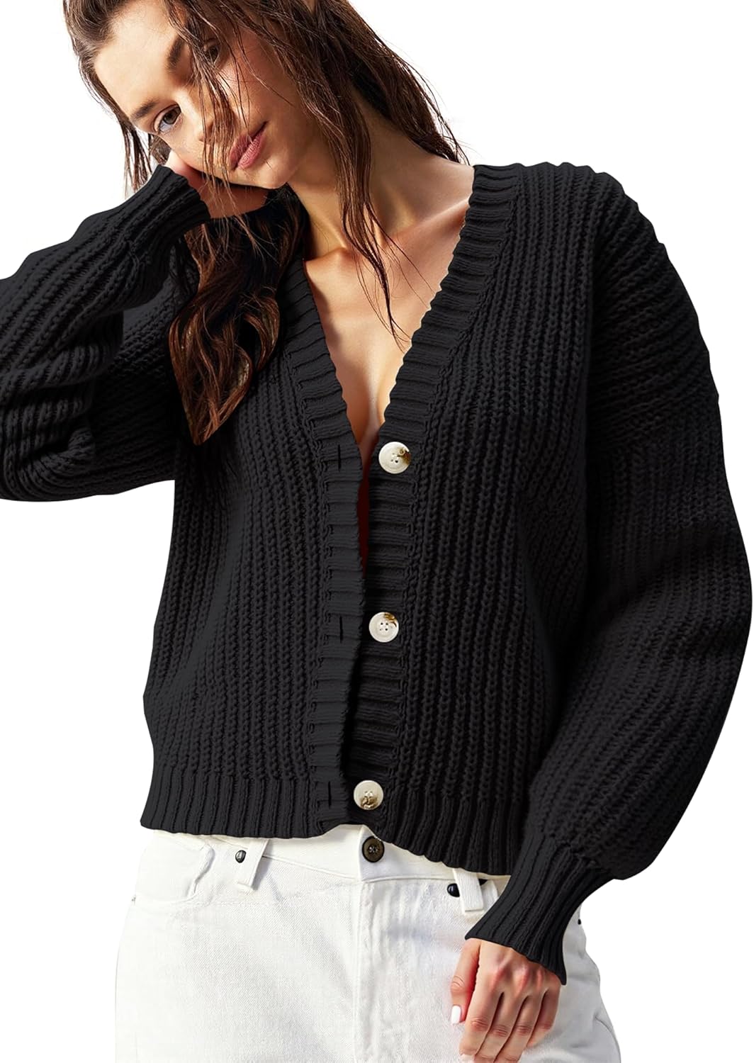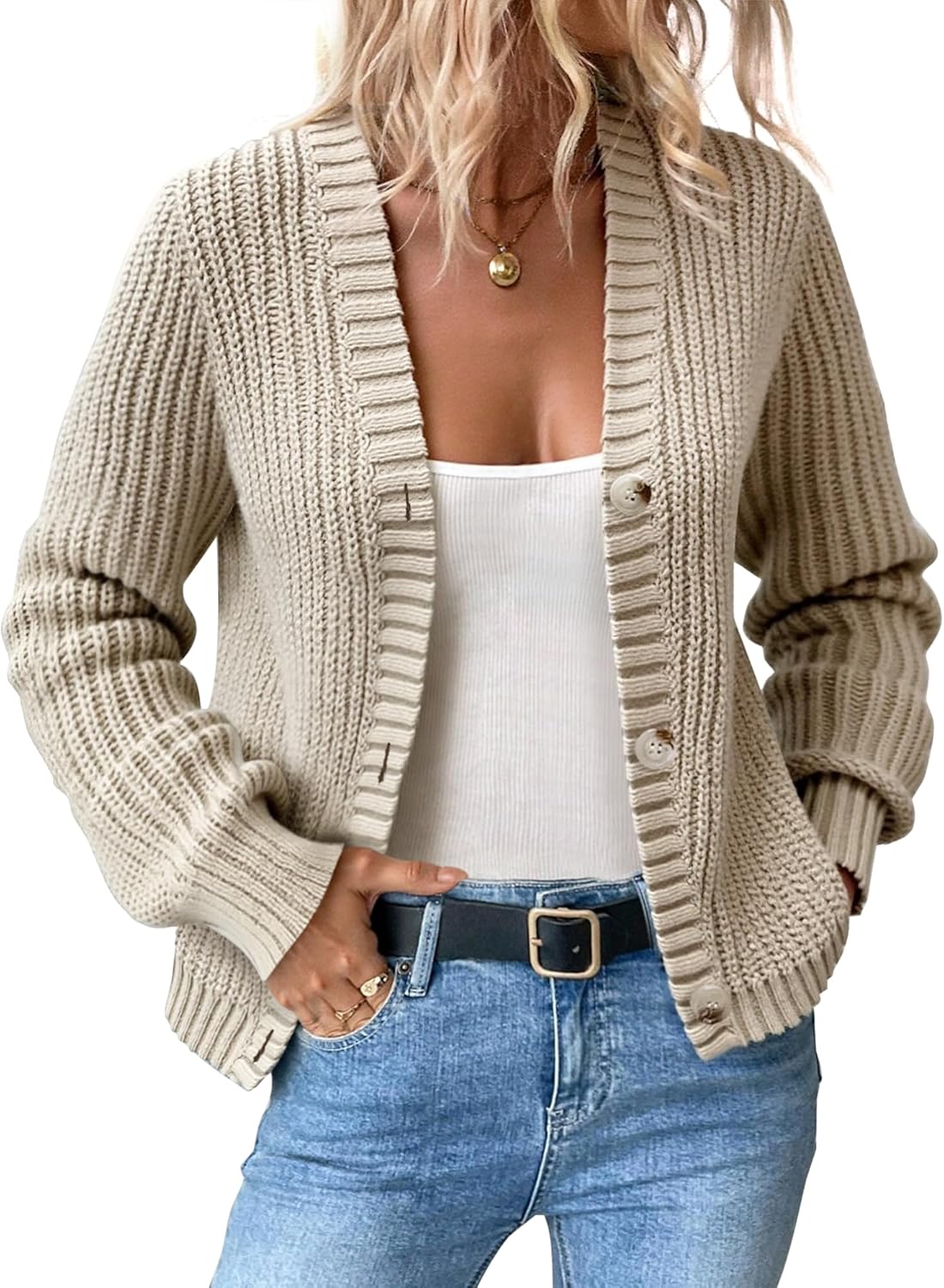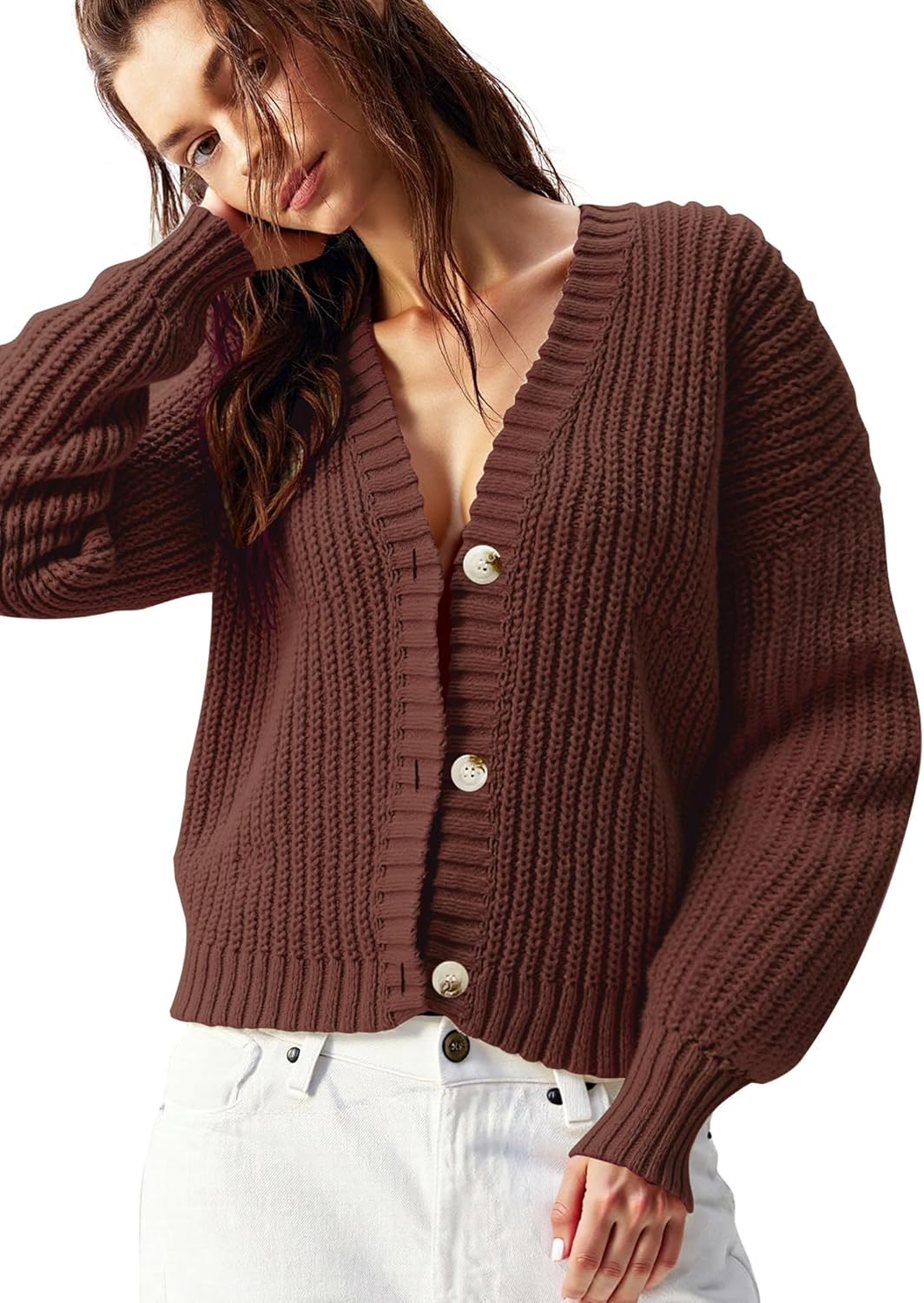 Women’s Chunky Knit Cardigan – Waffle Knit Button Down Oversized V Neck Fall Sweater for Casual Layering