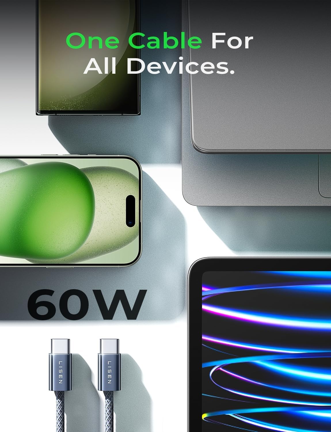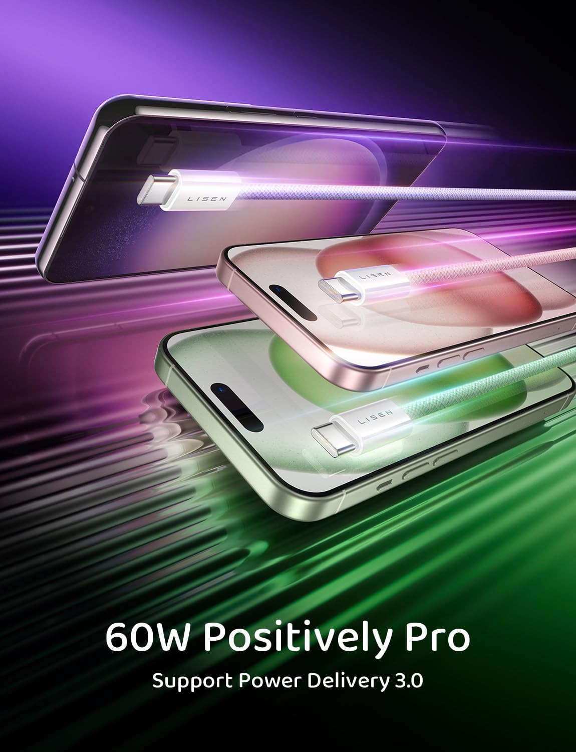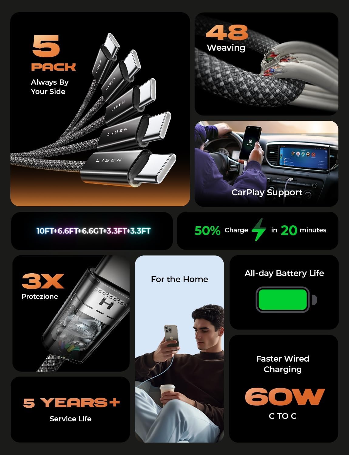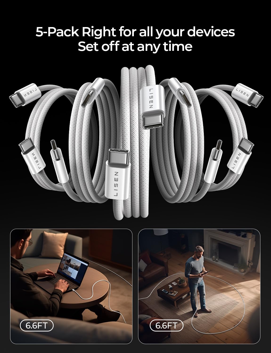 LISEN USB C Cable, 5-Pack [3.3/3.3/6.6/6.6/10FT] for iPhone 17 Charger Cord, 60W USB C to USB C Fast Charging Cable for iPhone 17 Air 16 15 Pro Max, Samsung Z Flip 7/S25/S24, Switch 2, iPad, MacBook