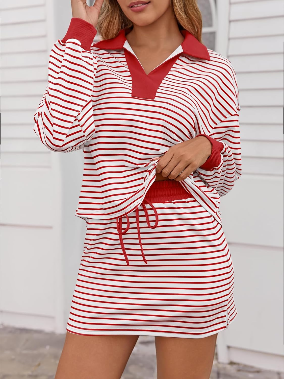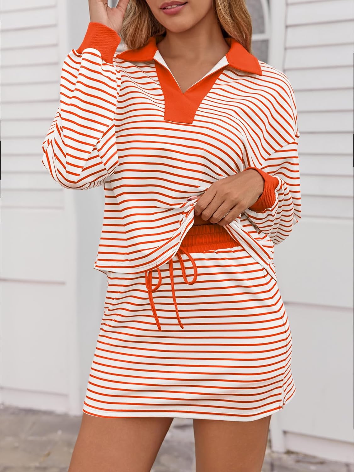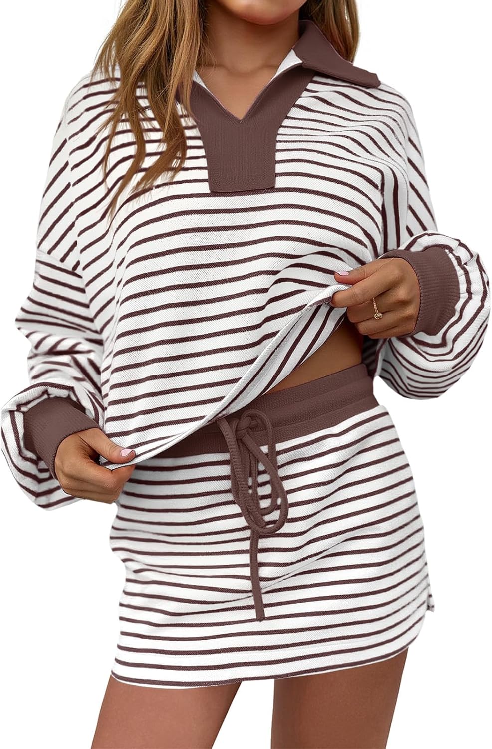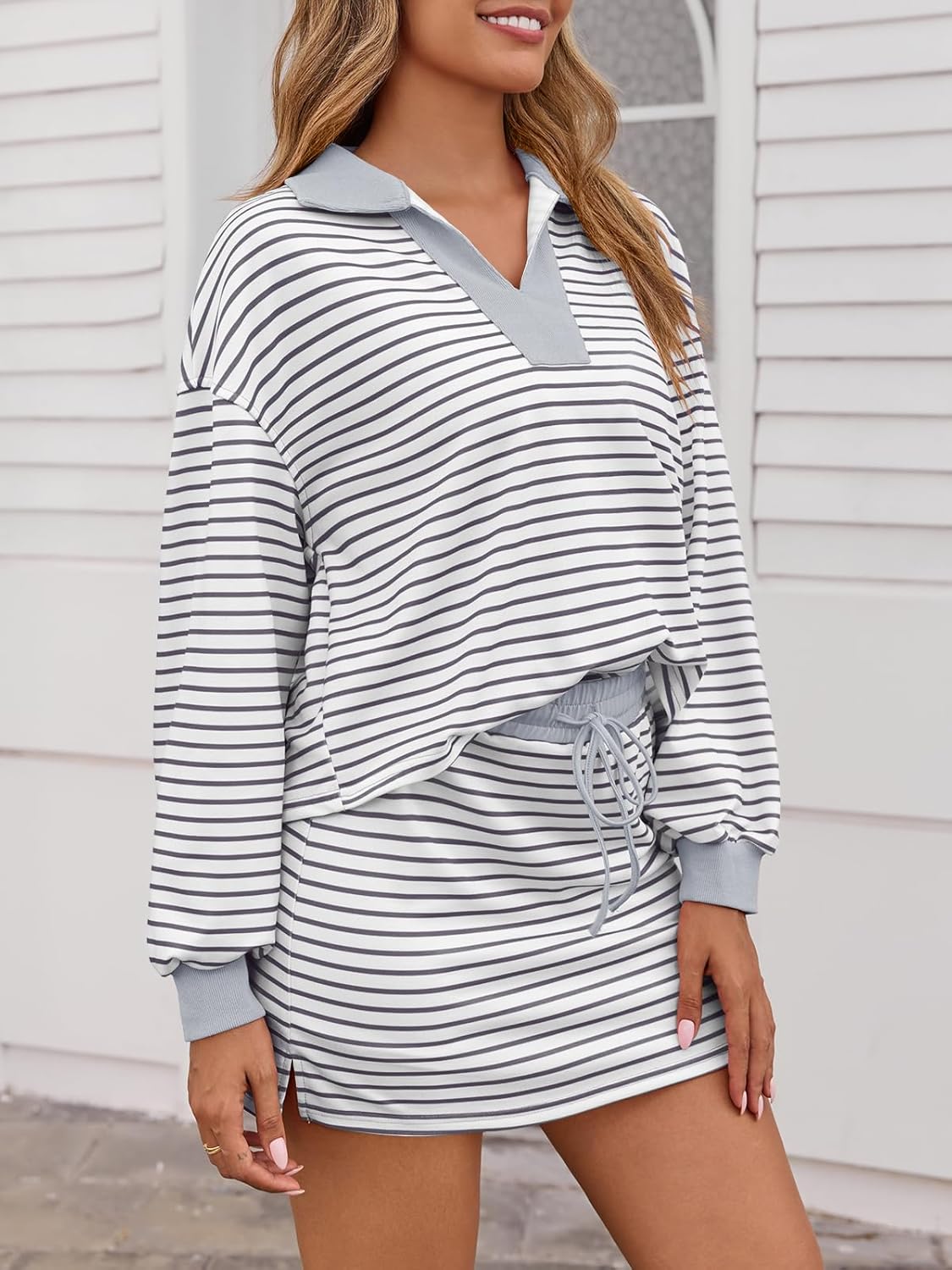 Fisoew Womens Striped 2 Piece Outfits Casual Sweatshirt Skirt Set Long Sleeve Skort Workout Set Matching Lounge Sets