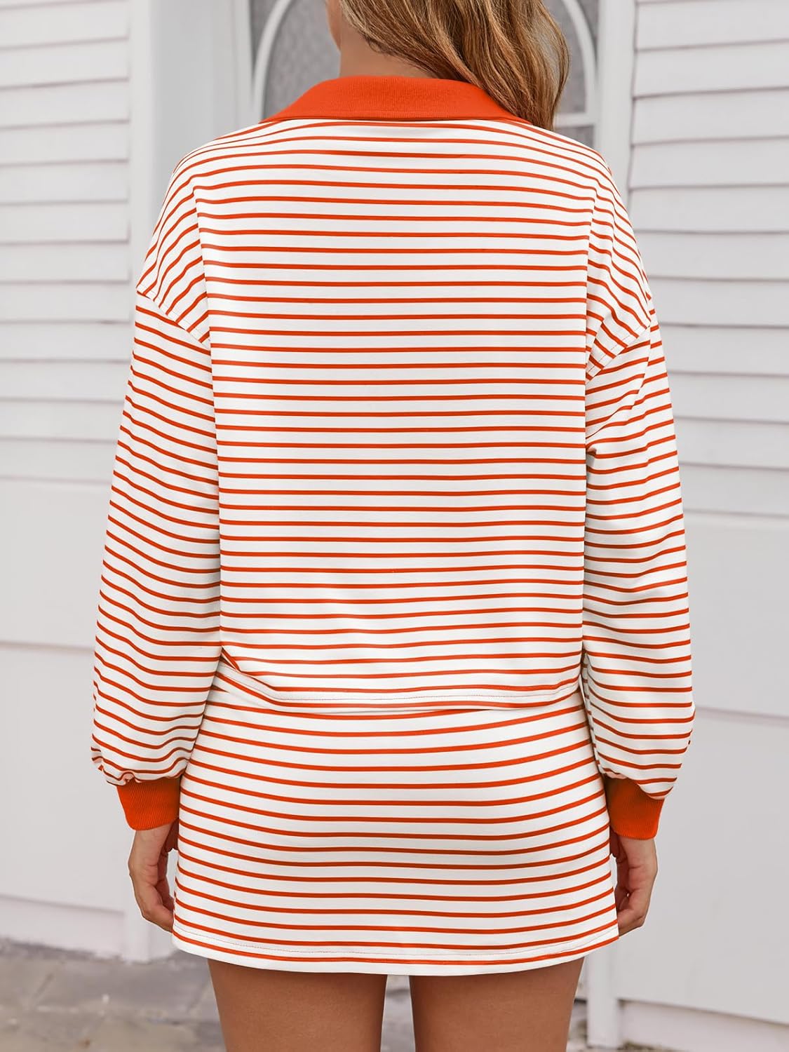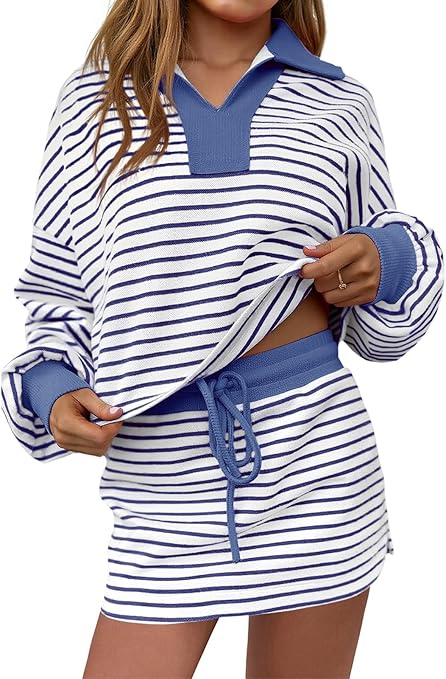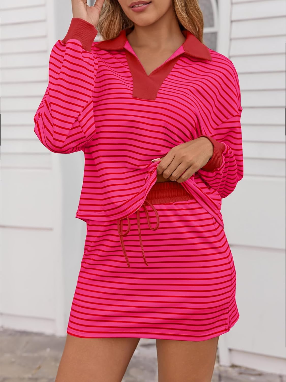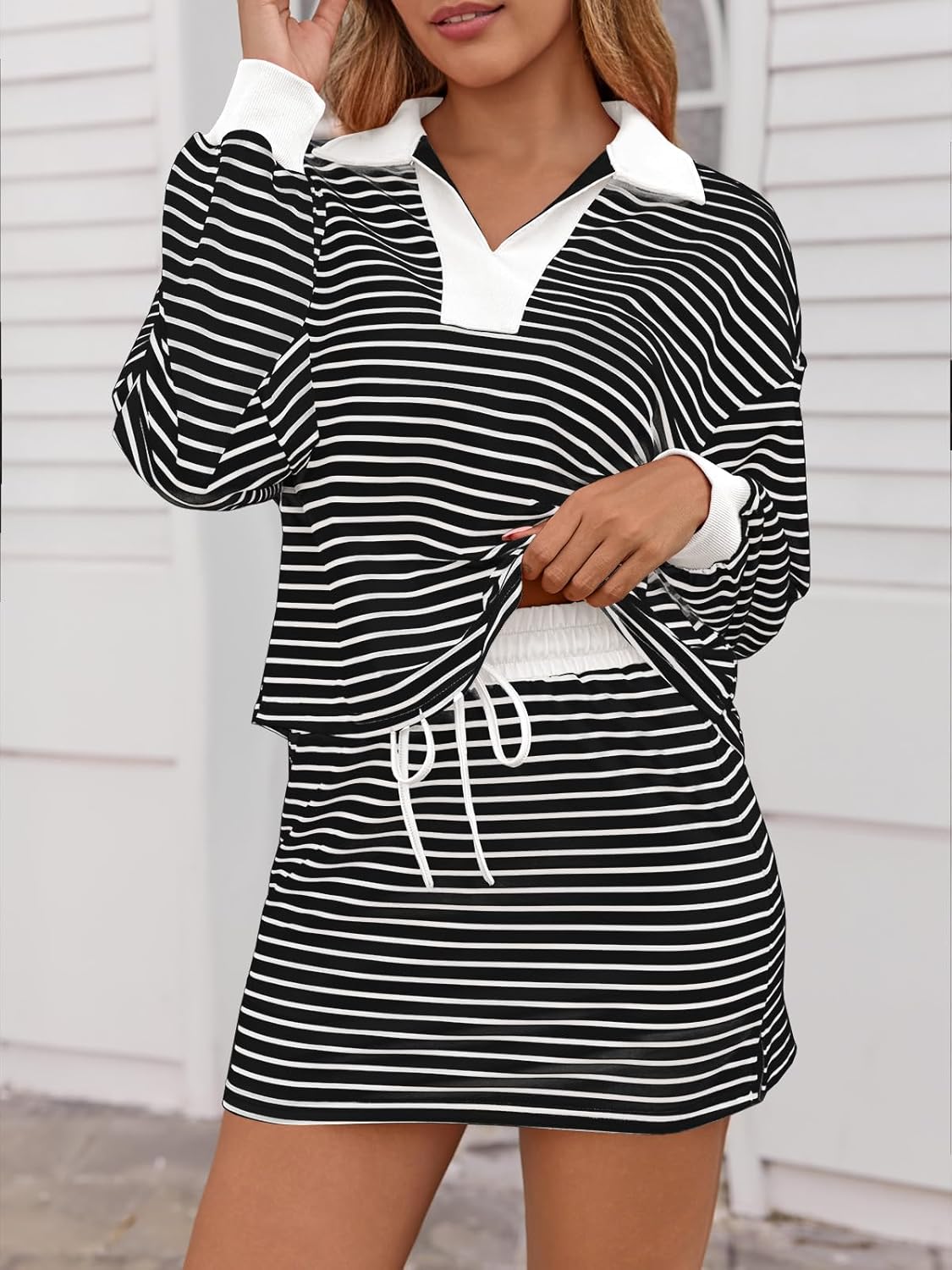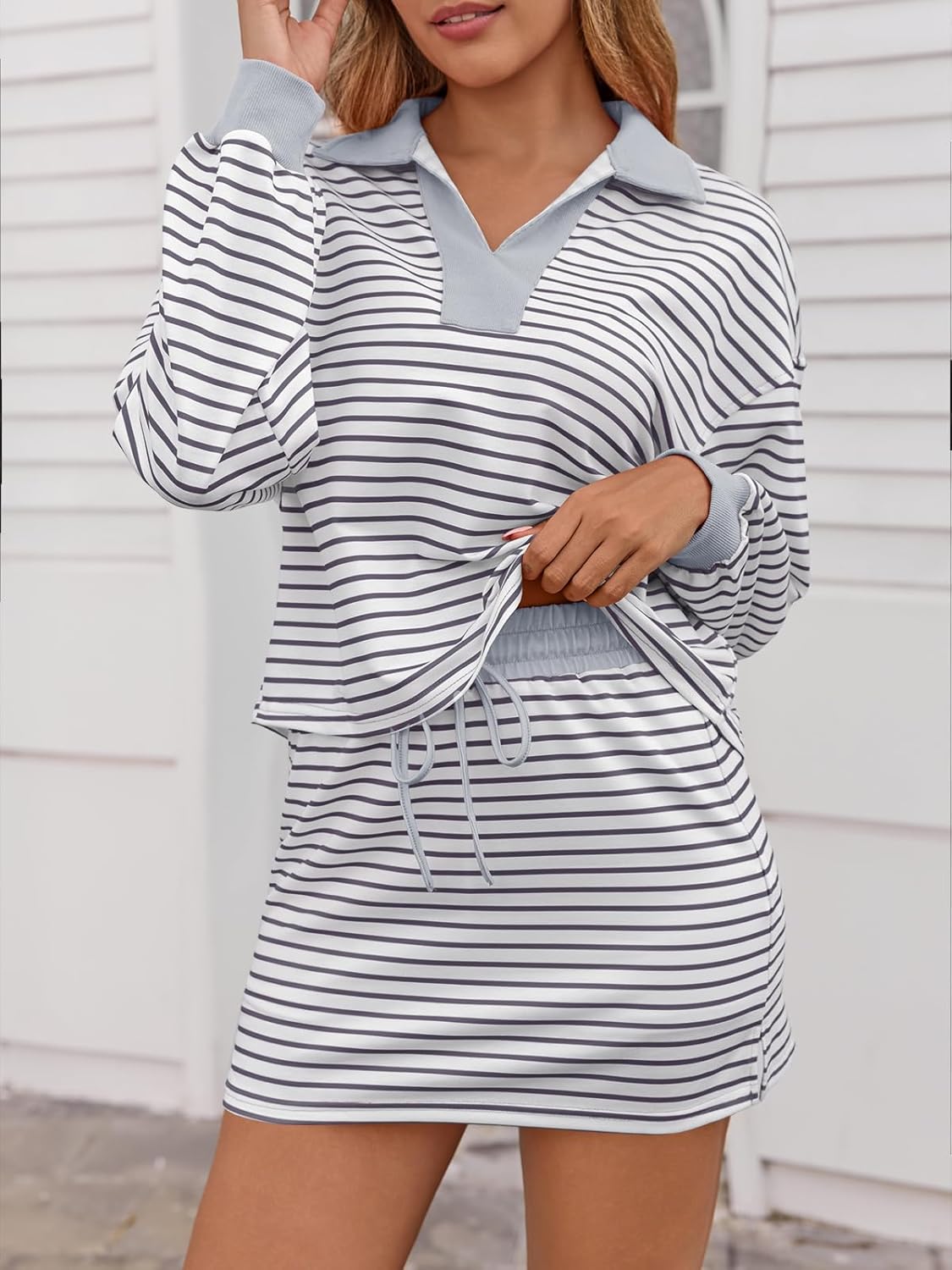 Fisoew Womens Striped 2 Piece Outfits Casual Sweatshirt Skirt Set Long Sleeve Skort Workout Set Matching Lounge Sets