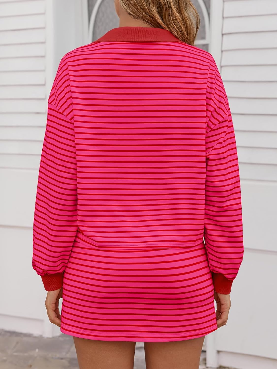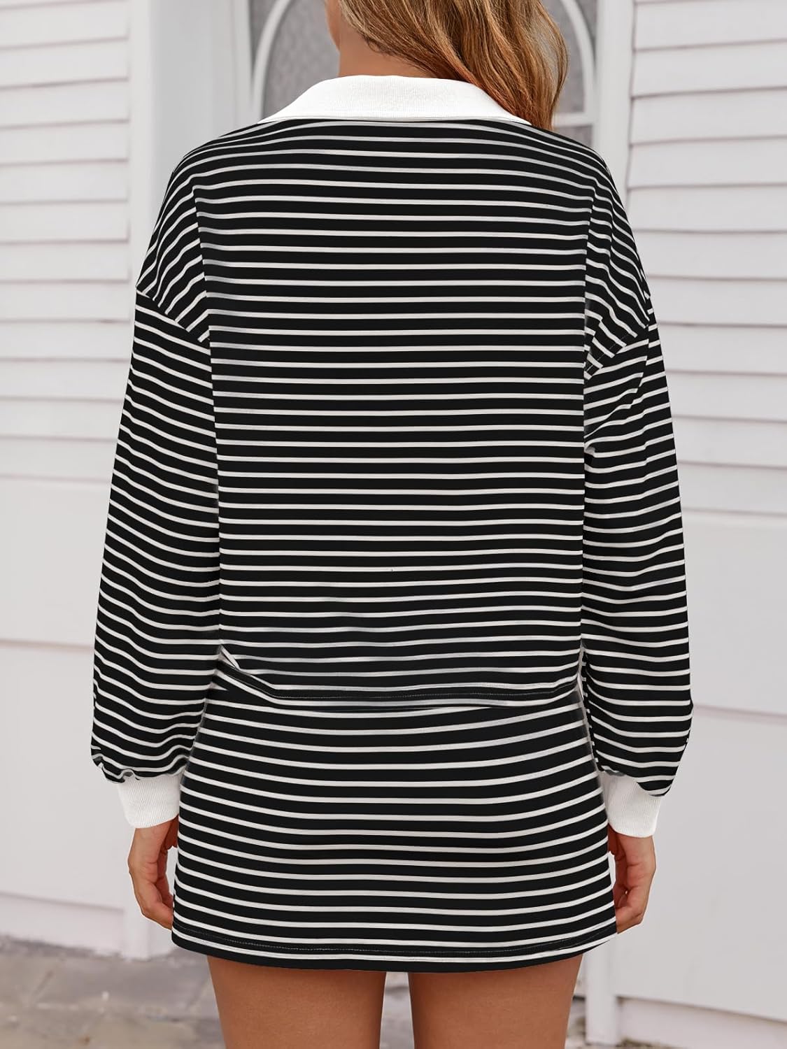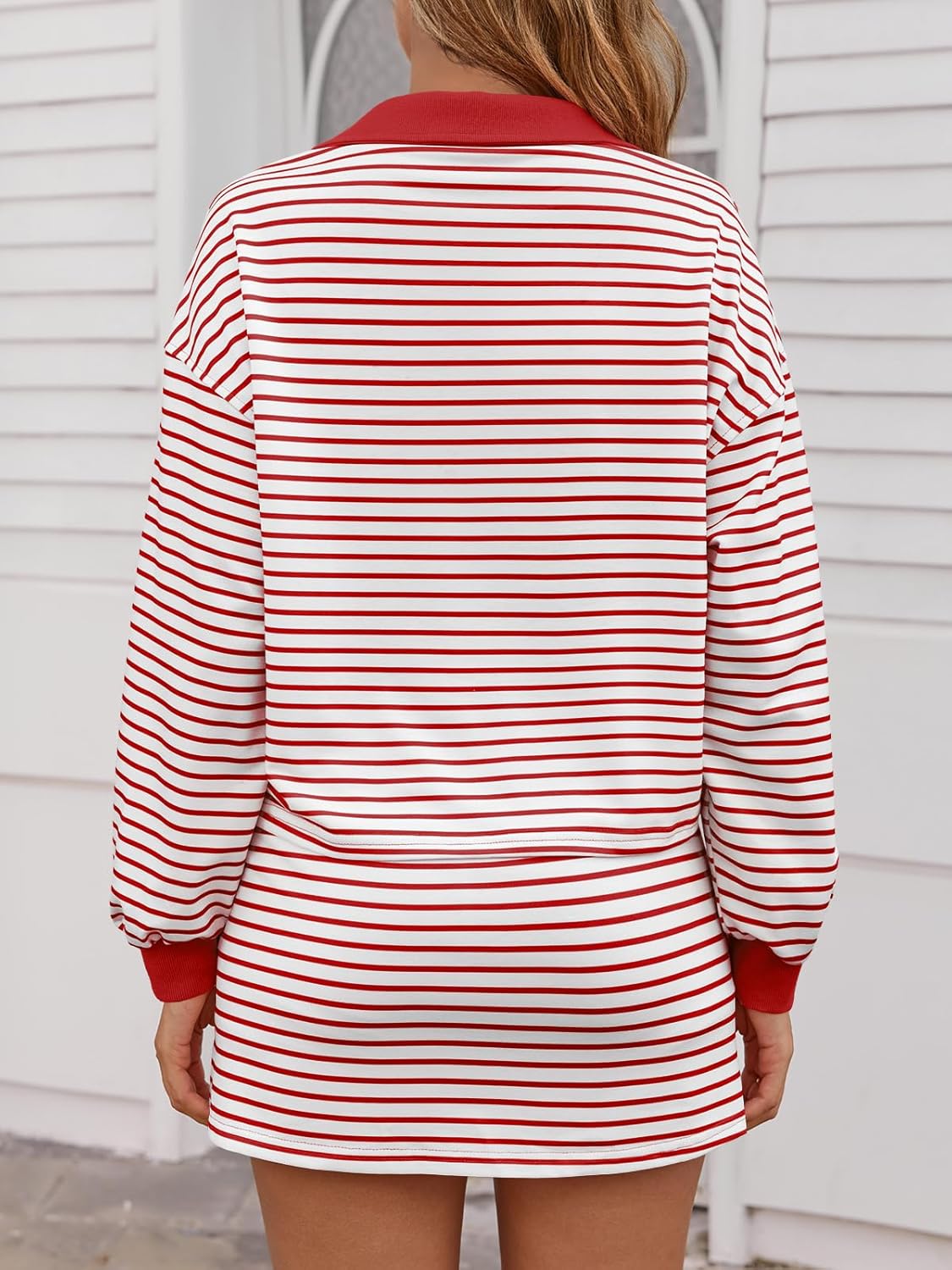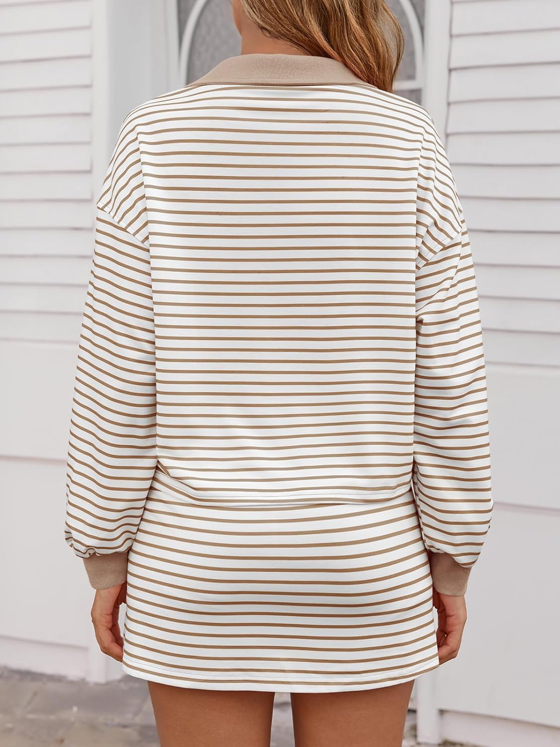 Fisoew Womens Striped 2 Piece Outfits Casual Sweatshirt Skirt Set Long Sleeve Skort Workout Set Matching Lounge Sets