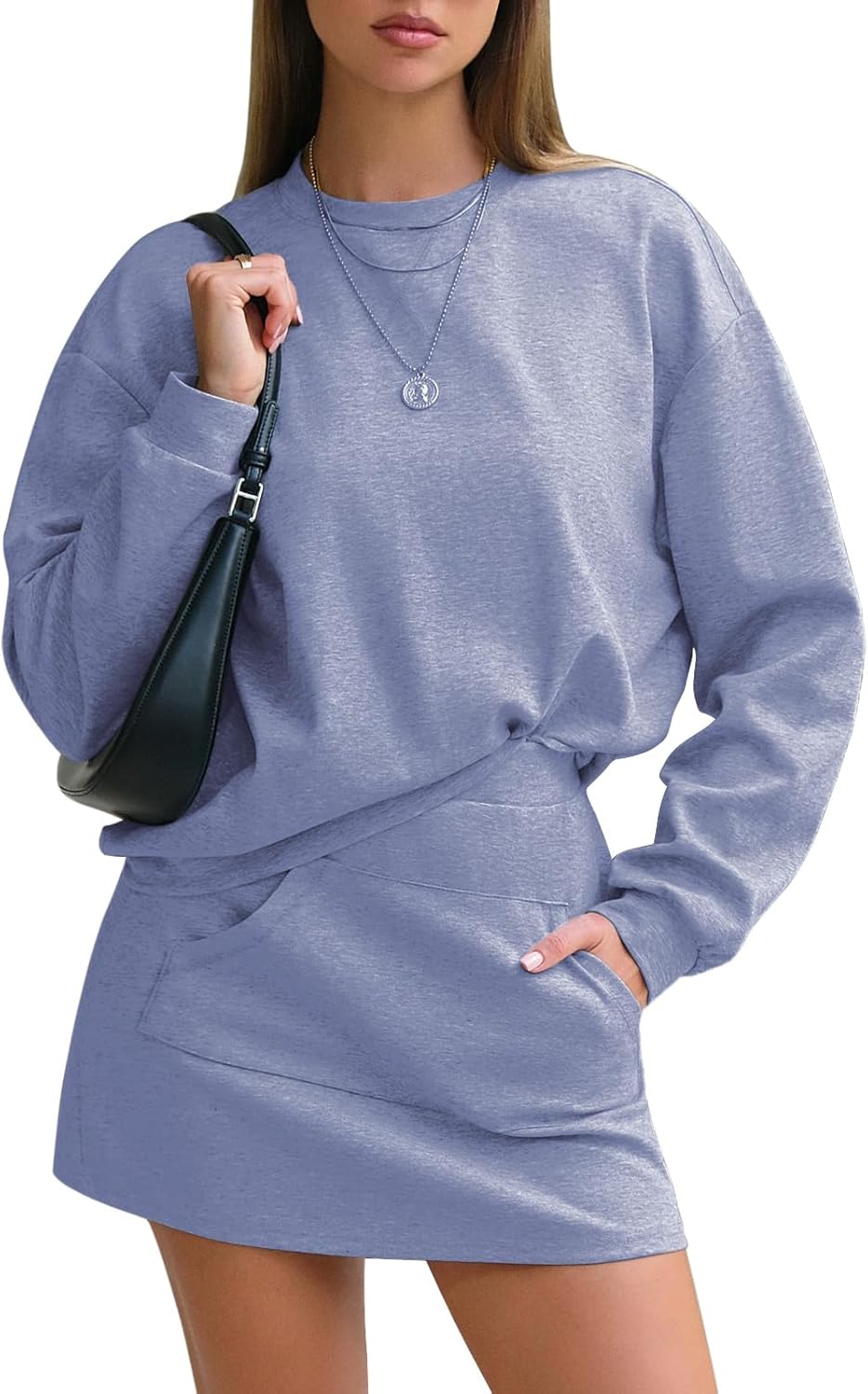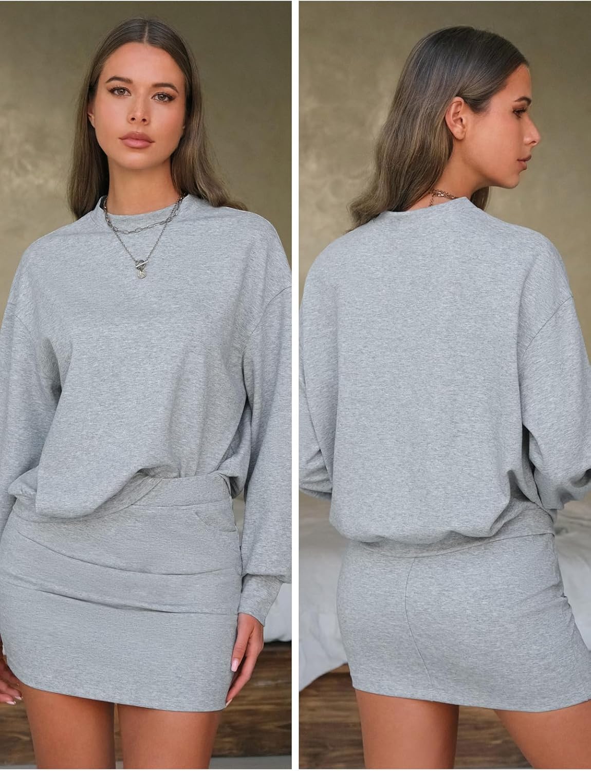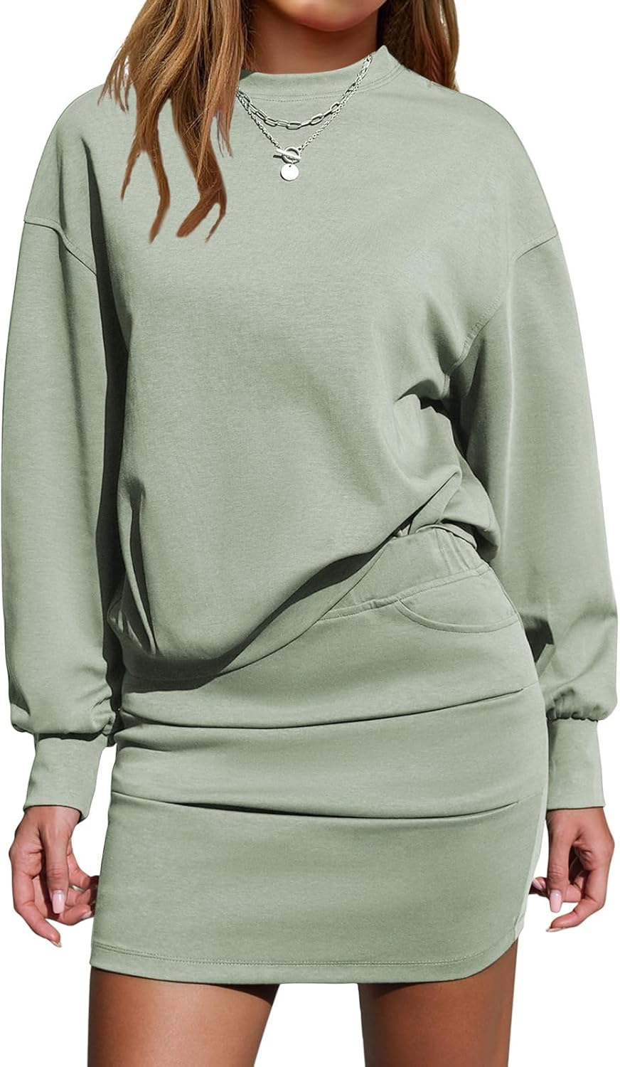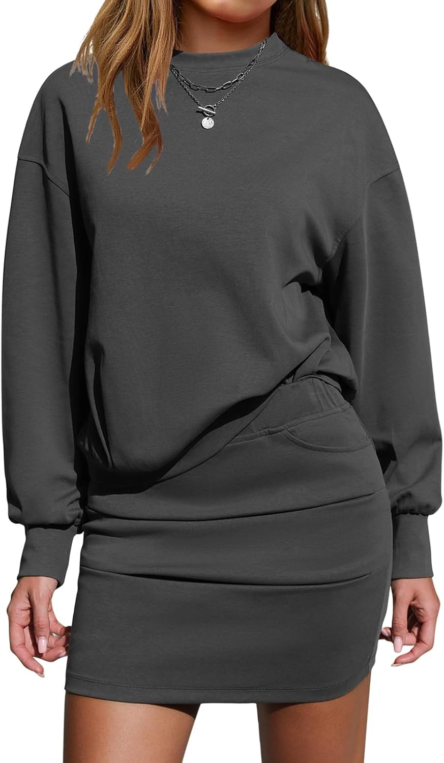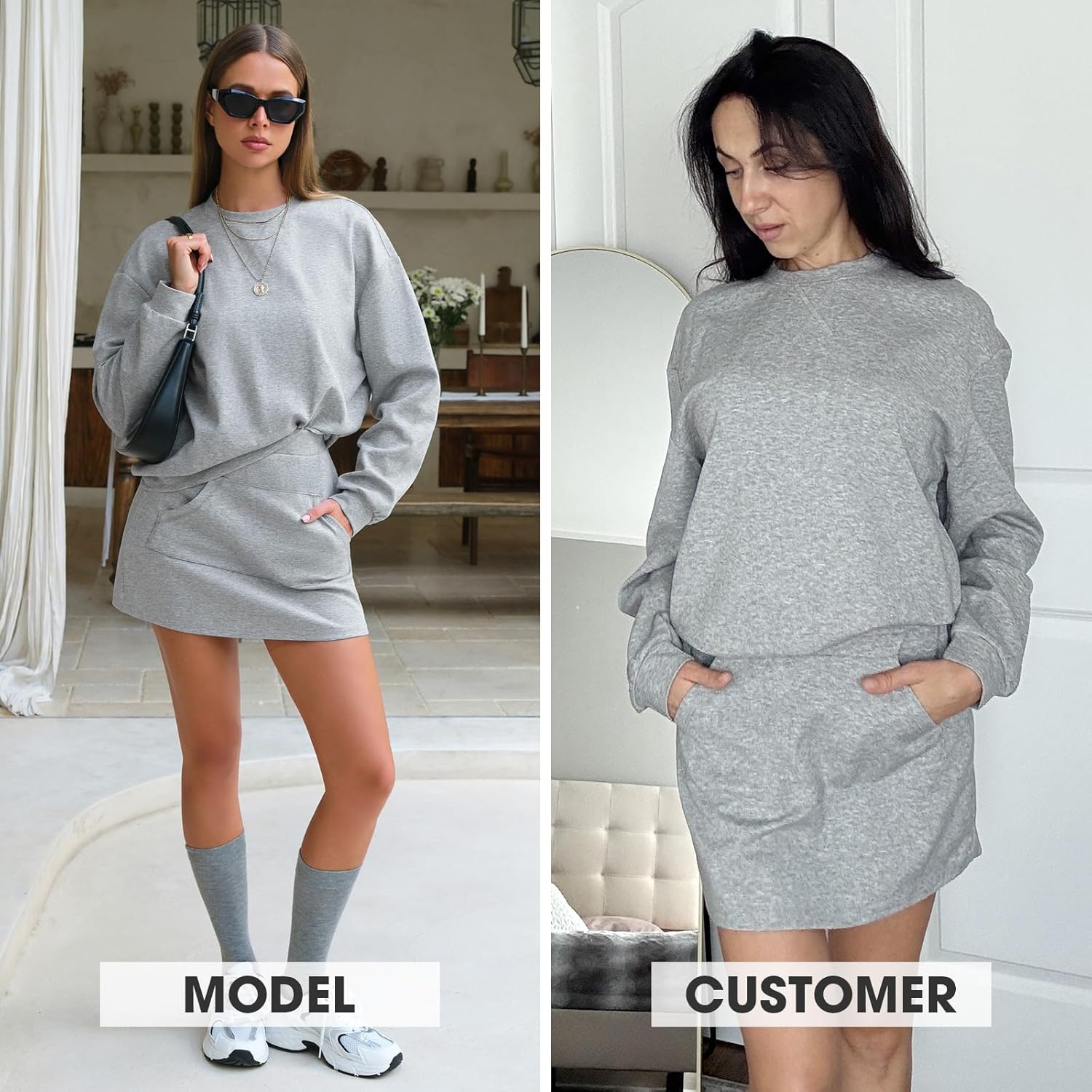 EXLURA Women 2 Piece Sets Cotton Tracksuits Workout Set Crewneck Sweatshirt Skort Short Skirt Fall Tennis Sweat Suits Pockets