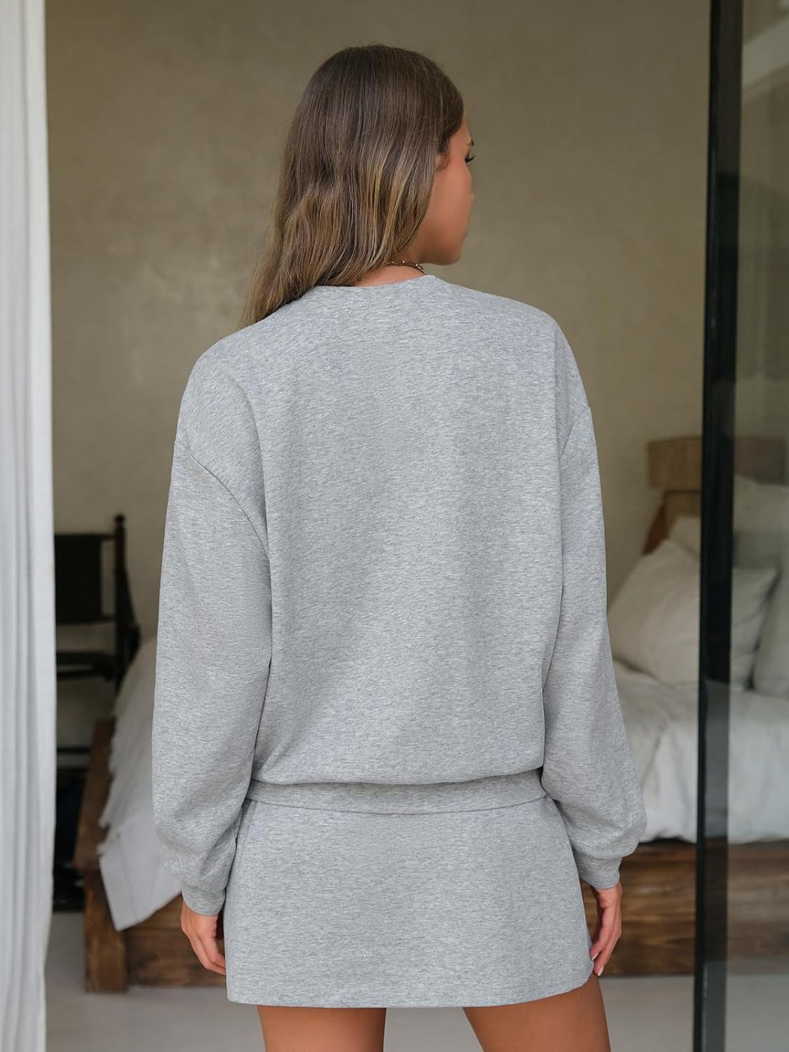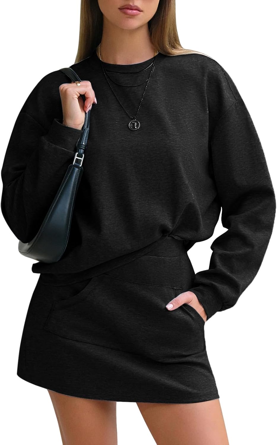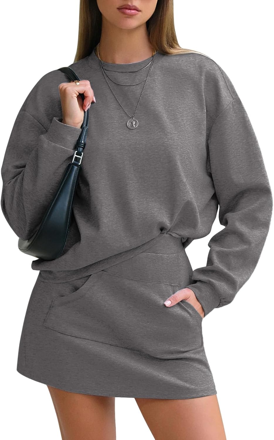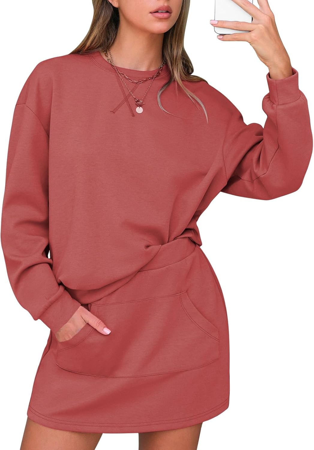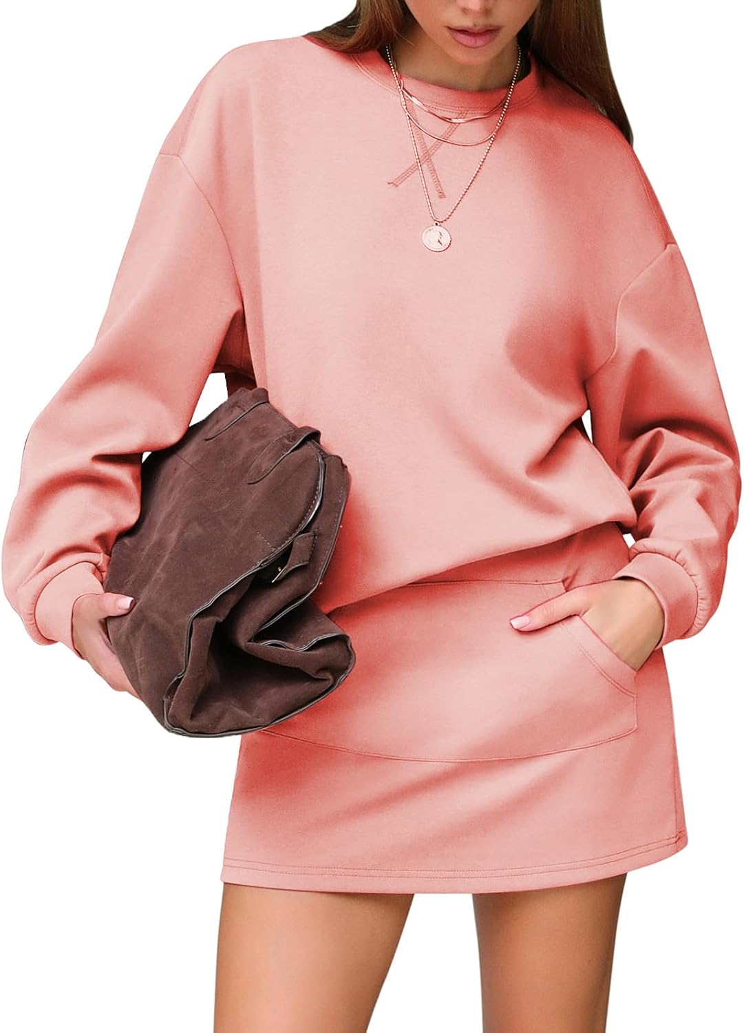 EXLURA Women 2 Piece Sets Cotton Tracksuits Workout Set Crewneck Sweatshirt Skort Short Skirt Fall Tennis Sweat Suits Pockets