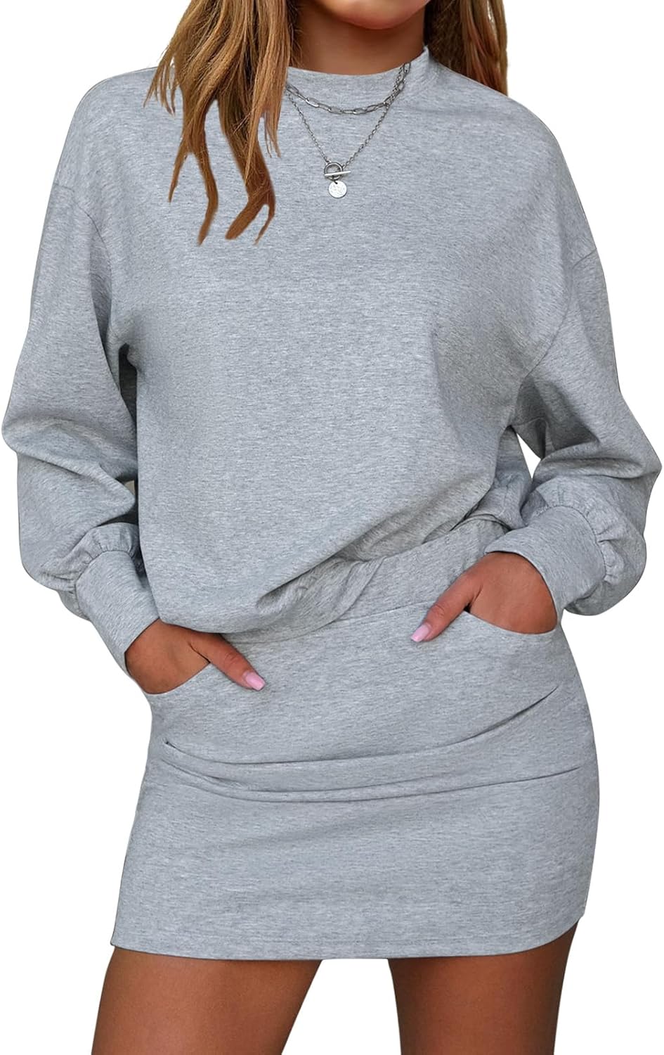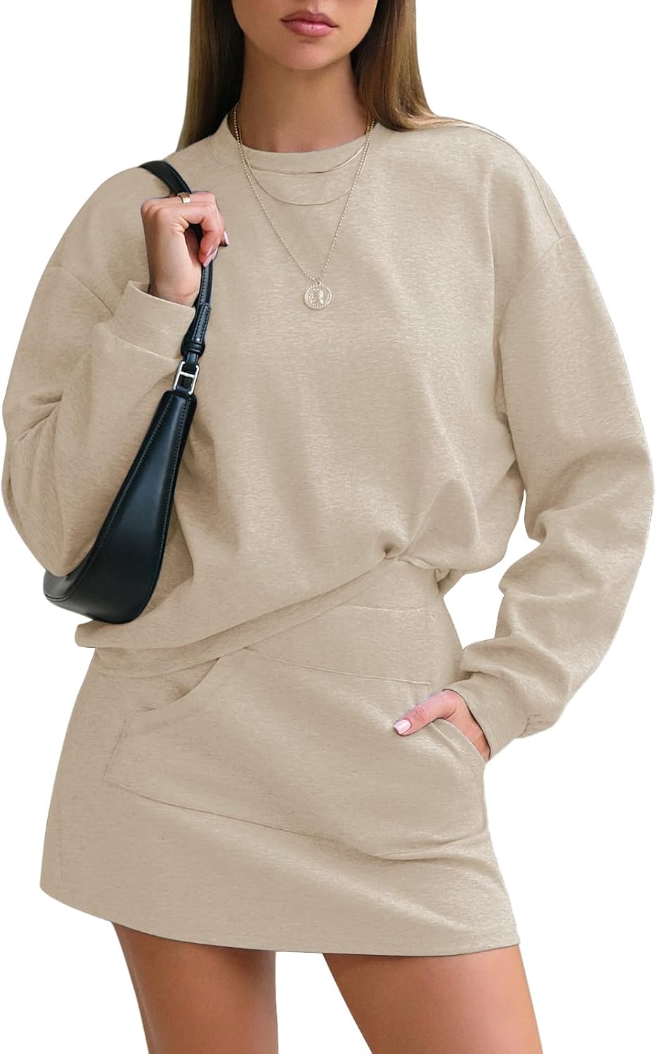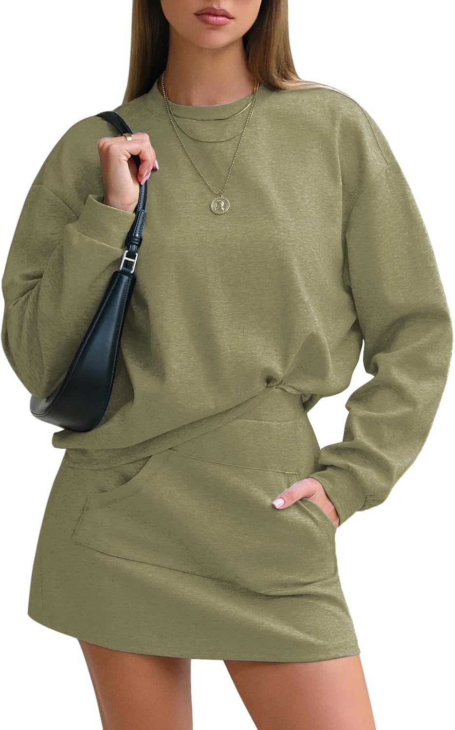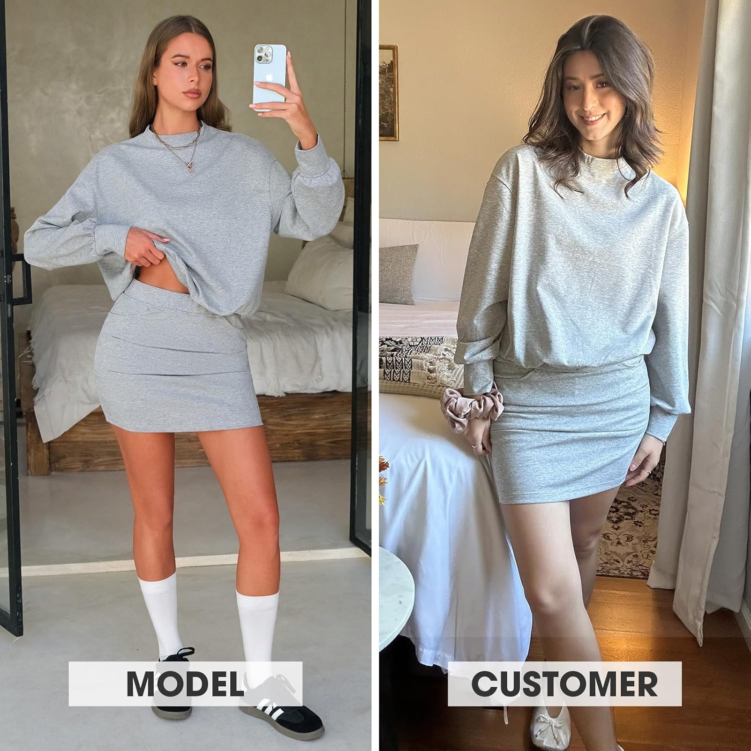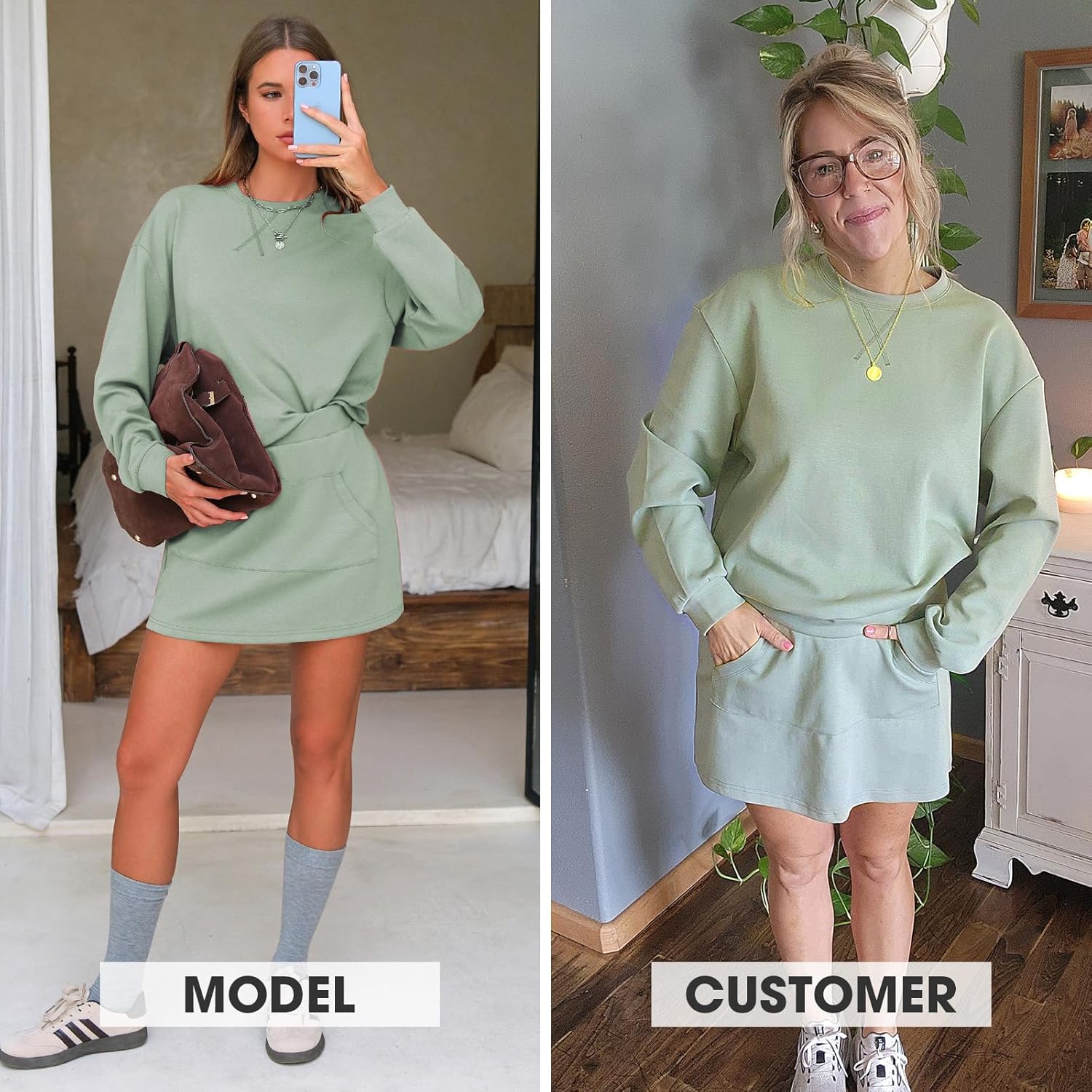 EXLURA Women 2 Piece Sets Cotton Tracksuits Workout Set Crewneck Sweatshirt Skort Short Skirt Fall Tennis Sweat Suits Pockets